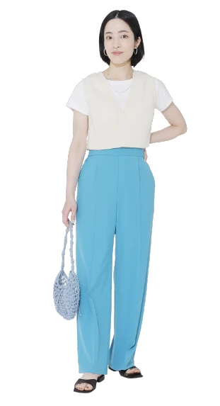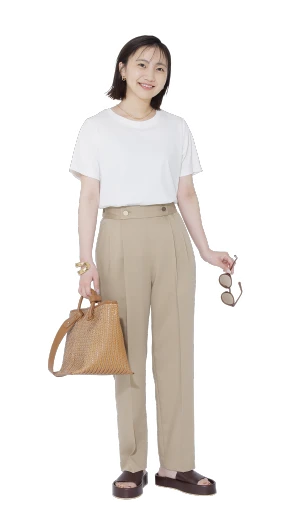 高すぎないウエスト位置、センタープレス入りのパンツで上品に仕上げて。程よくボディラインに沿うように、ウエストはインするのがおすすめです。