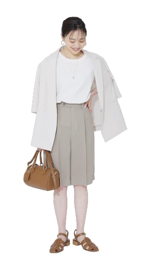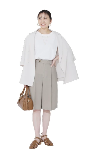 メリハリボディをシャープですっきりした印象に仕上げるジャケットに、ひざ下がきれいなストレートさんの特徴を生かしたハーフパンツ合わせ。得意なバッグの代表であるボストンバッグを合わせて、ハーフパンツ×Tシャツスタイルもストレートさんらしく品よく仕上がります。