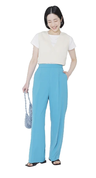 足し算が得意なウェーブさんに、短め丈のビスチェをプラス。Vネック部分には短めのネックレスを足して目線を上に。小さめでマチがなく、アクセサリー感覚のバッグを選ぶと華やかに仕上がります。