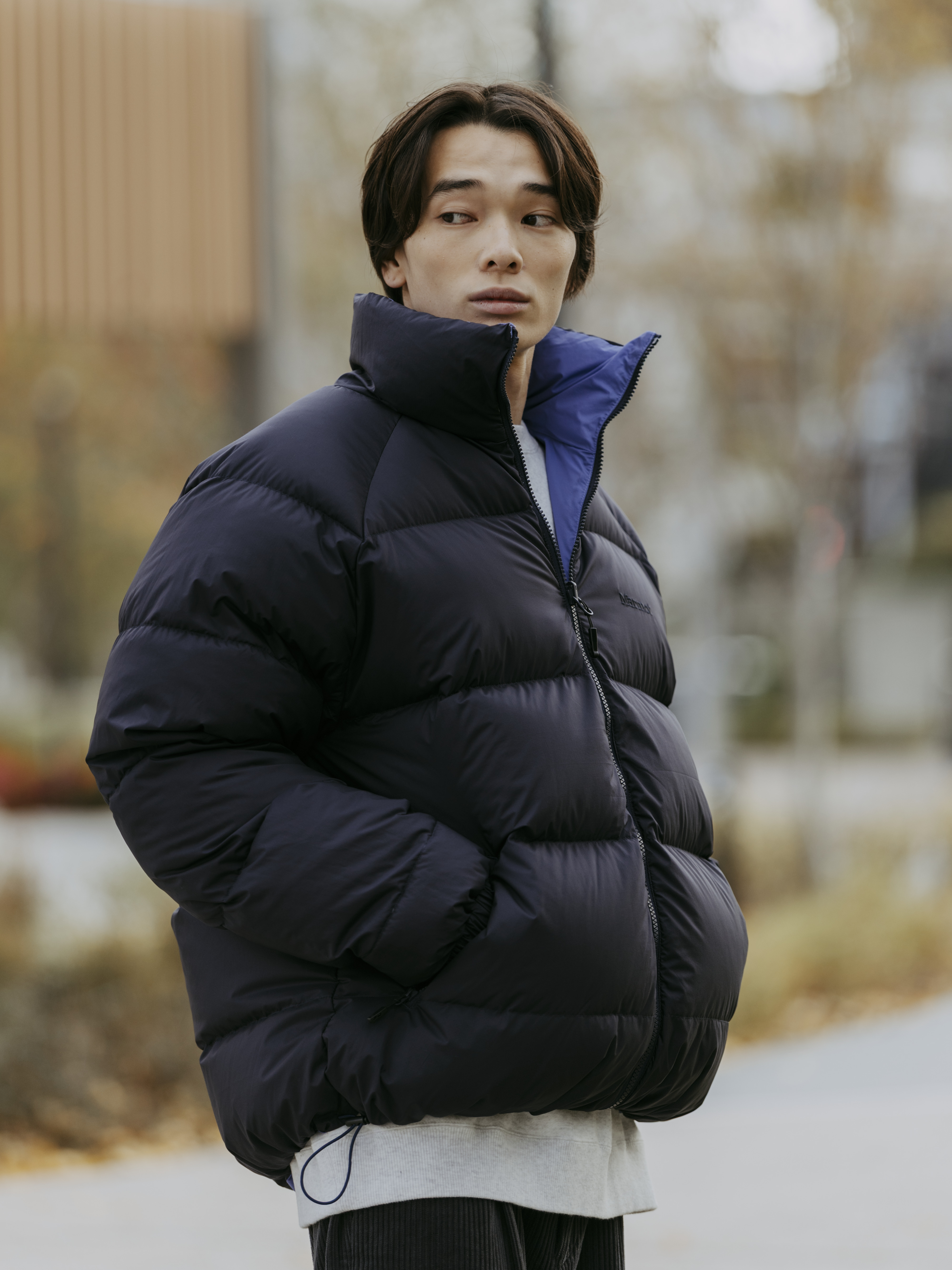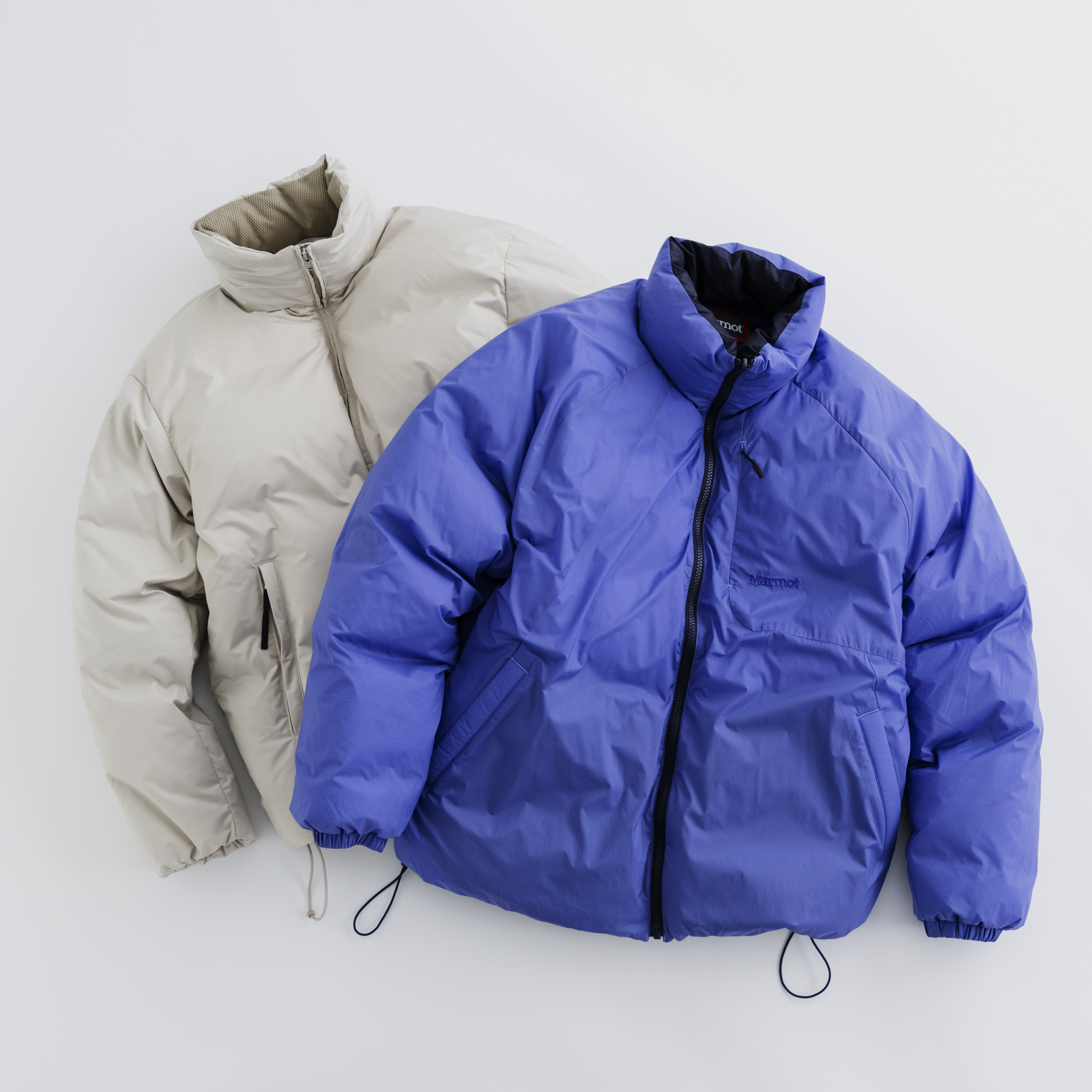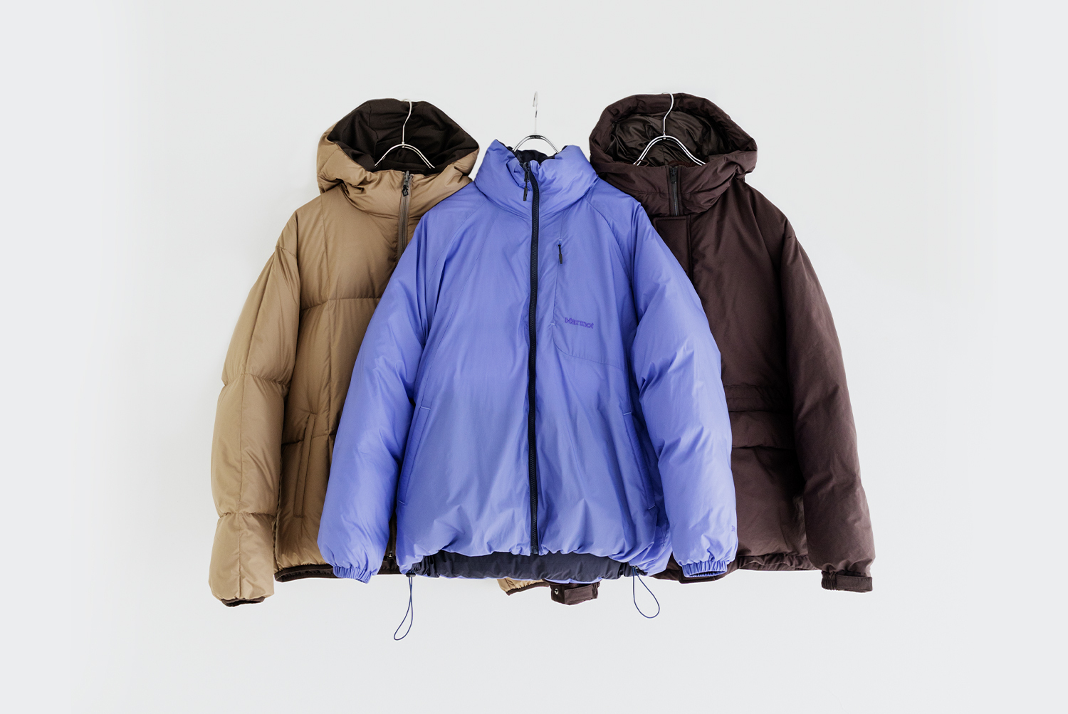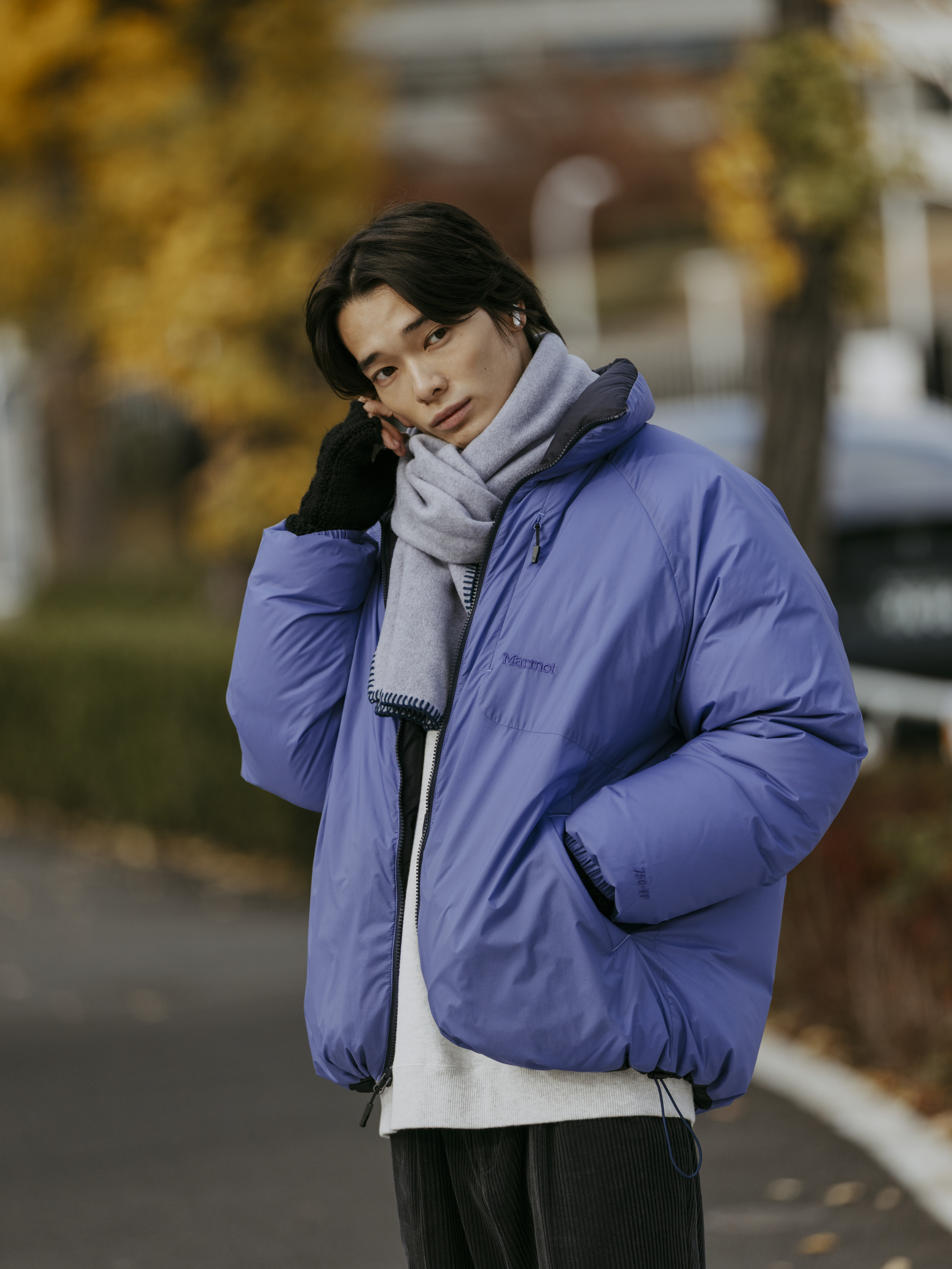 アメリカのアウトドアライフをベースにしたブランド<マーモット>との別注ダウンは、撥水性を備えた750フィルパワーダウンを挿入。かさ高がしっかりとあり、丸みを帯びたシルエットに。