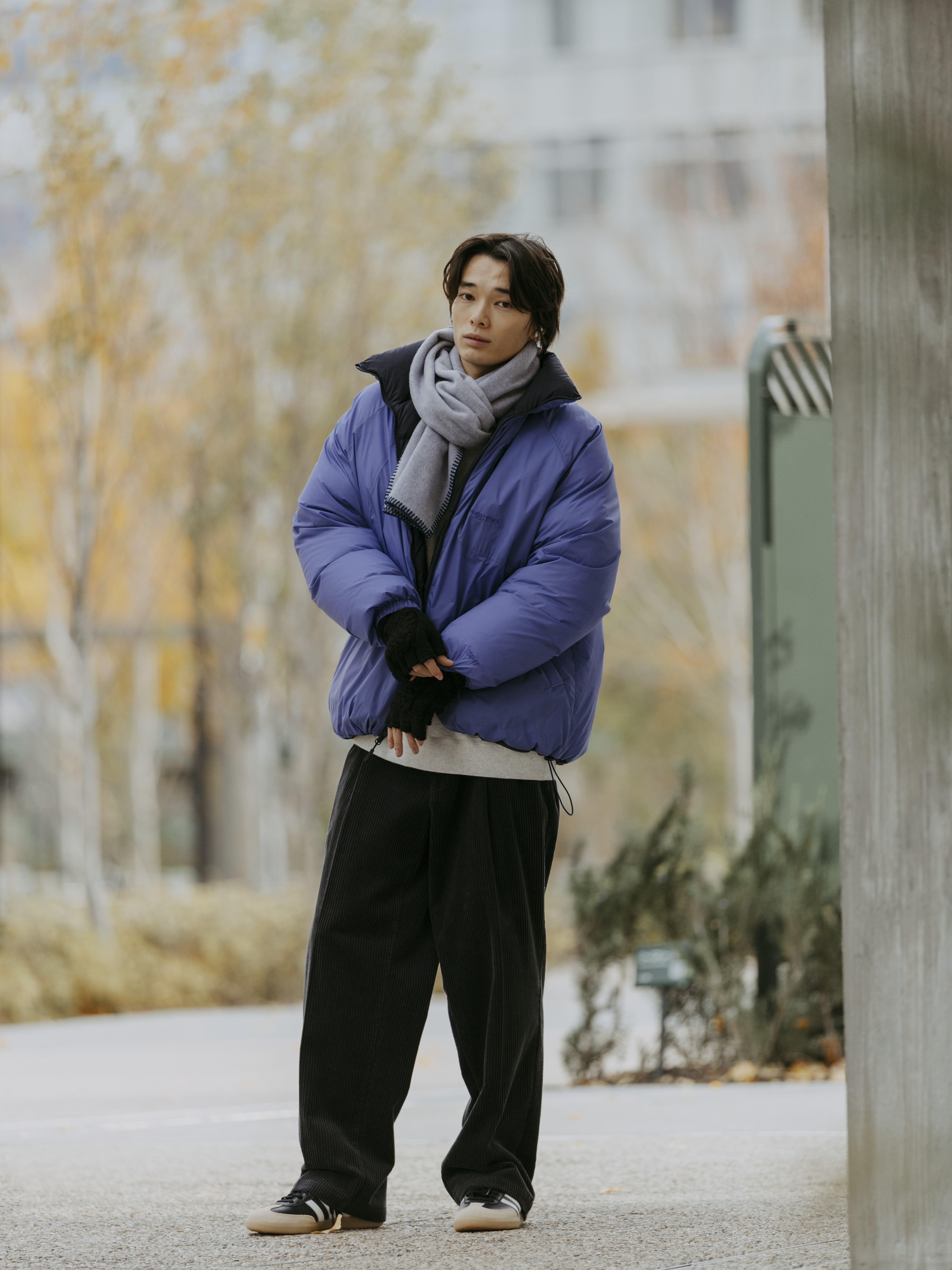 ゆったり感のあるネイビーのコーデュロイパンツで、ストリートなテイストを加味。青みがかったパープルのシェルをブラックのパンツで引き締めます。