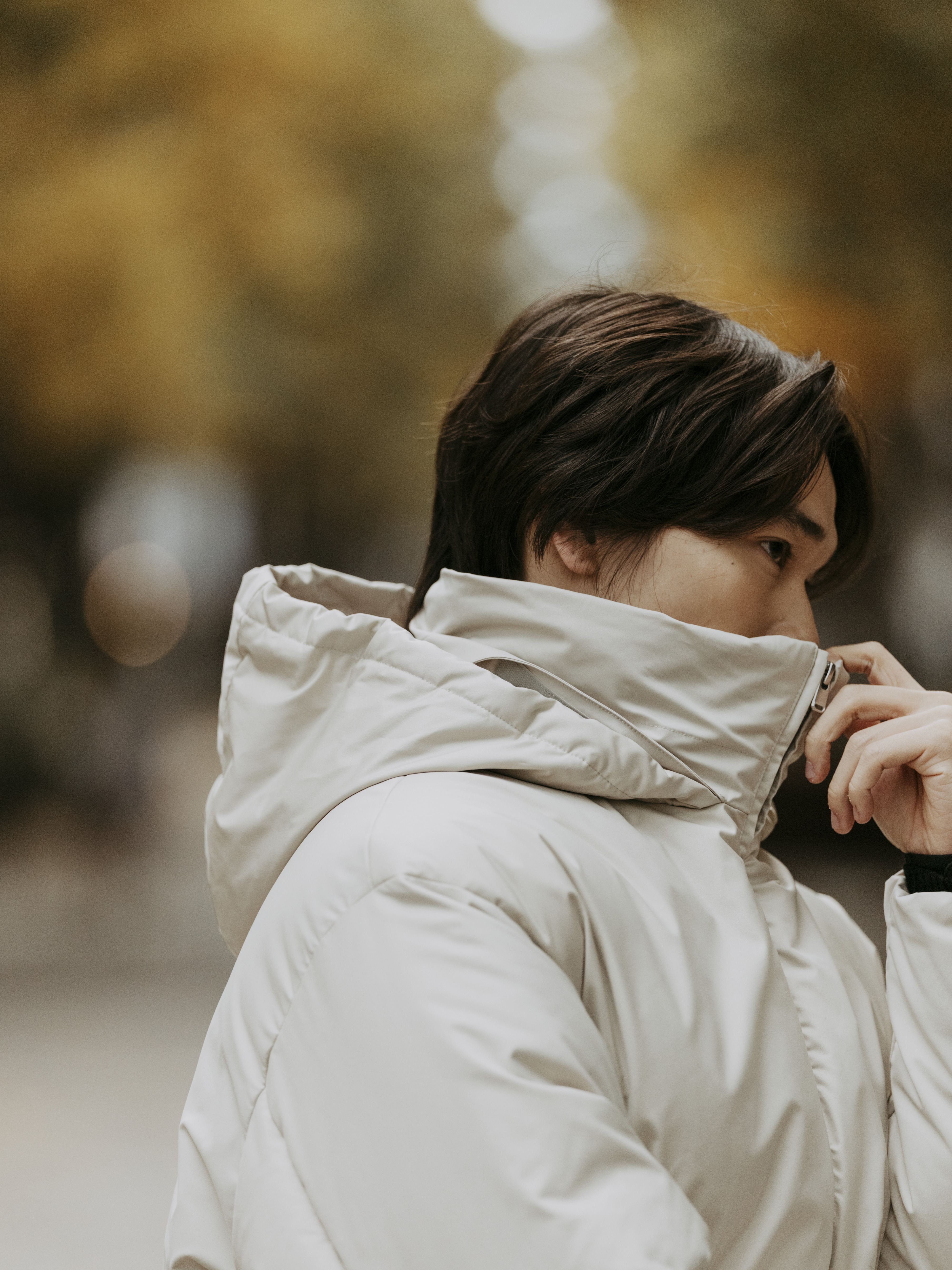 冬コーデらしいエレガンスを醸したいなら、思い切って白ダウンというチョイスもおすすめ。ダークトーンを選びがちななかで、雪景色のような明るさを持つこちらのアウターならば、街中でも目を引く存在に。