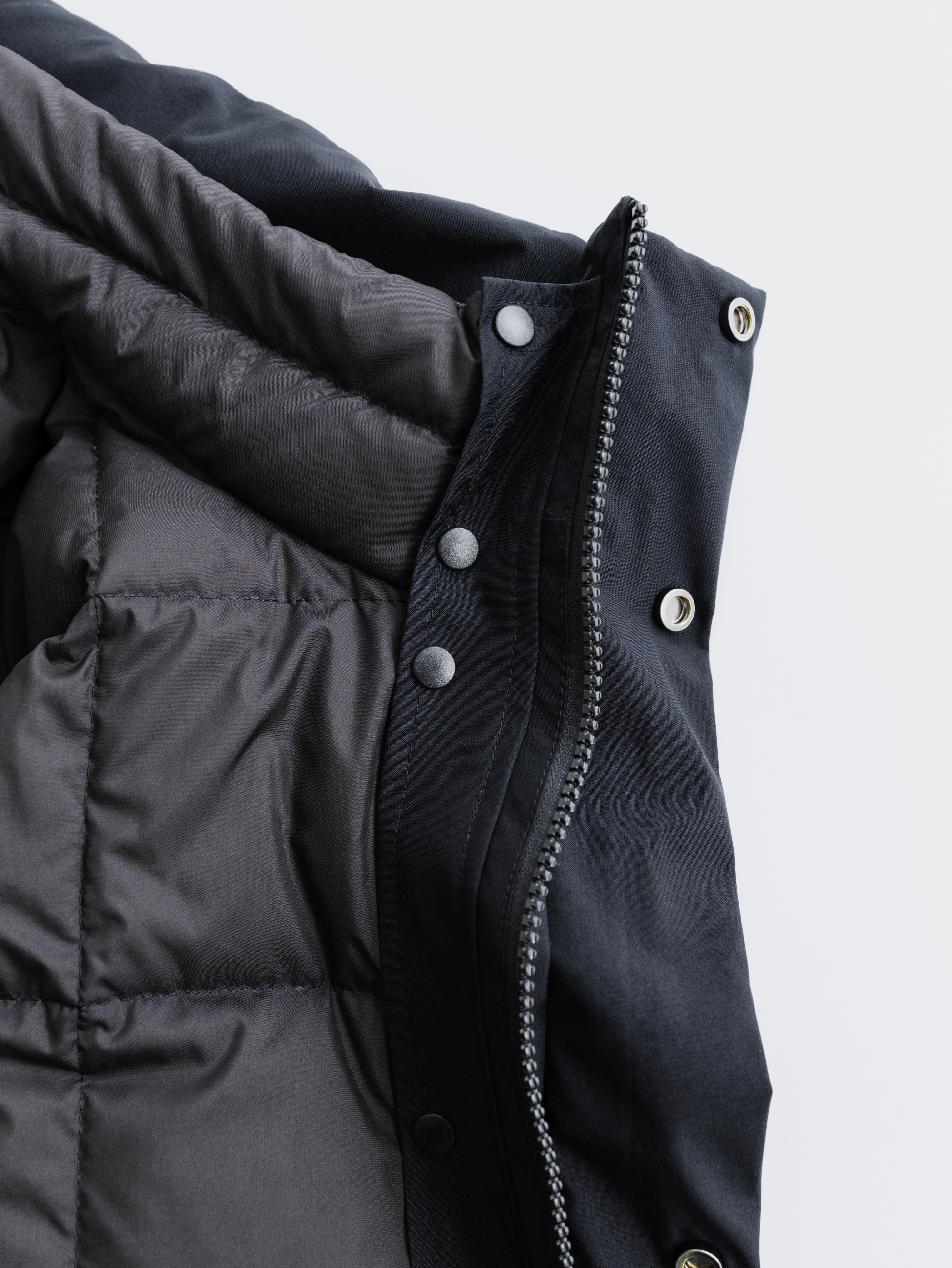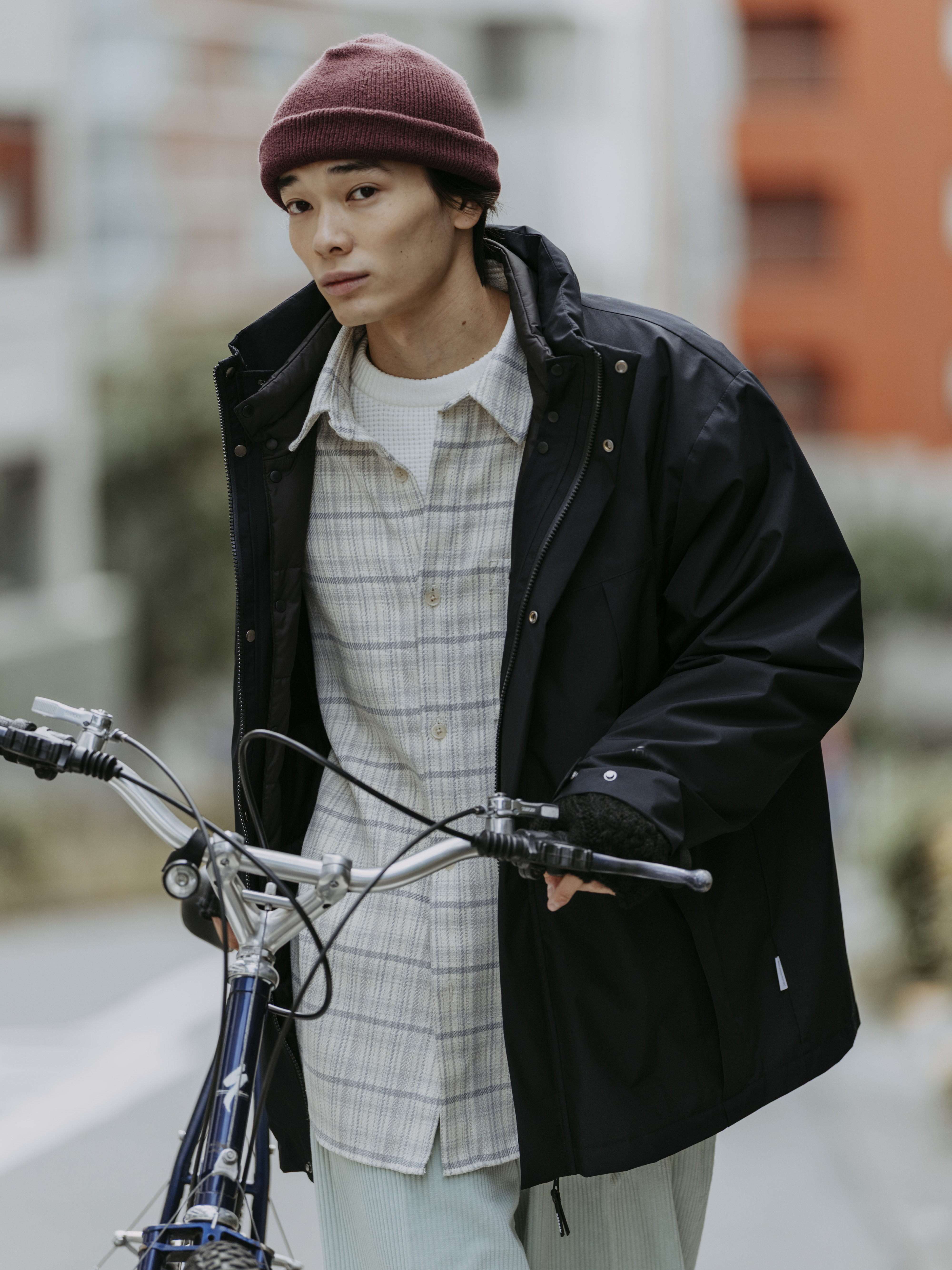 インナーダウンをセットすると、アウトドアブランドのダウンらしいボリューム感と、ブラックのカラーリングがもたらす都会的なムードが同居。