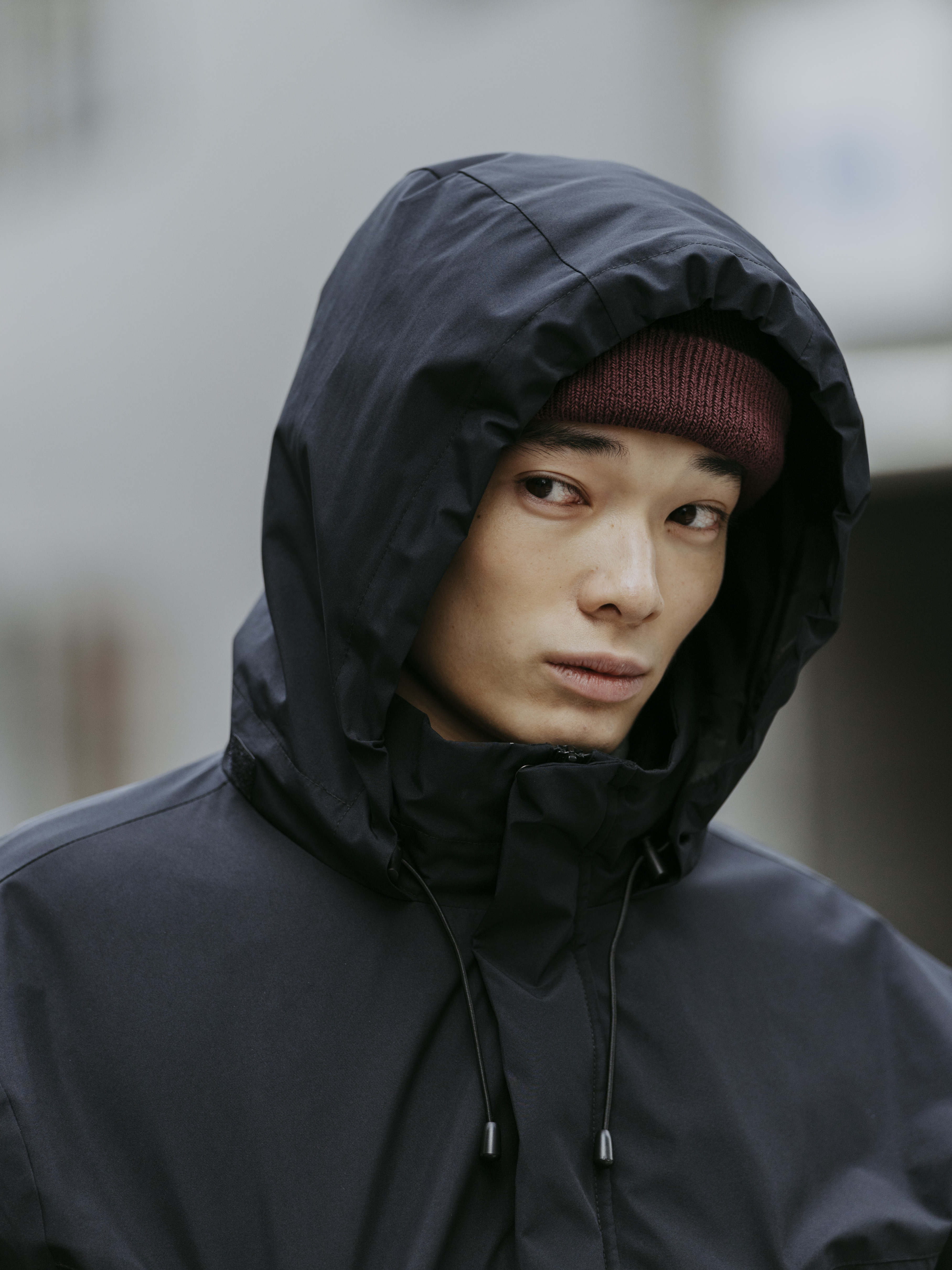 シェルの首裏にはフードが装着。出すことでよりスポーティな着こなしも可能に。