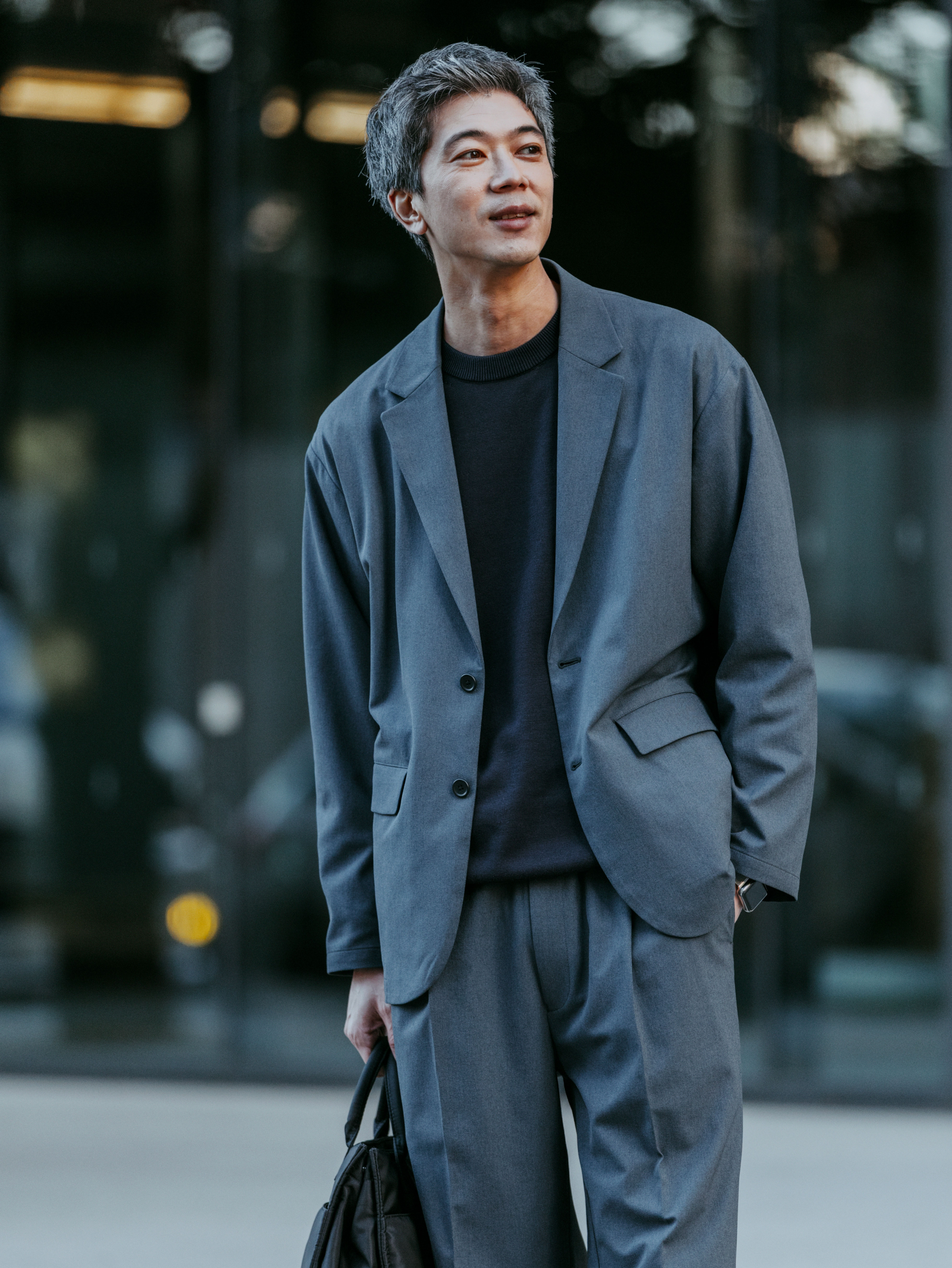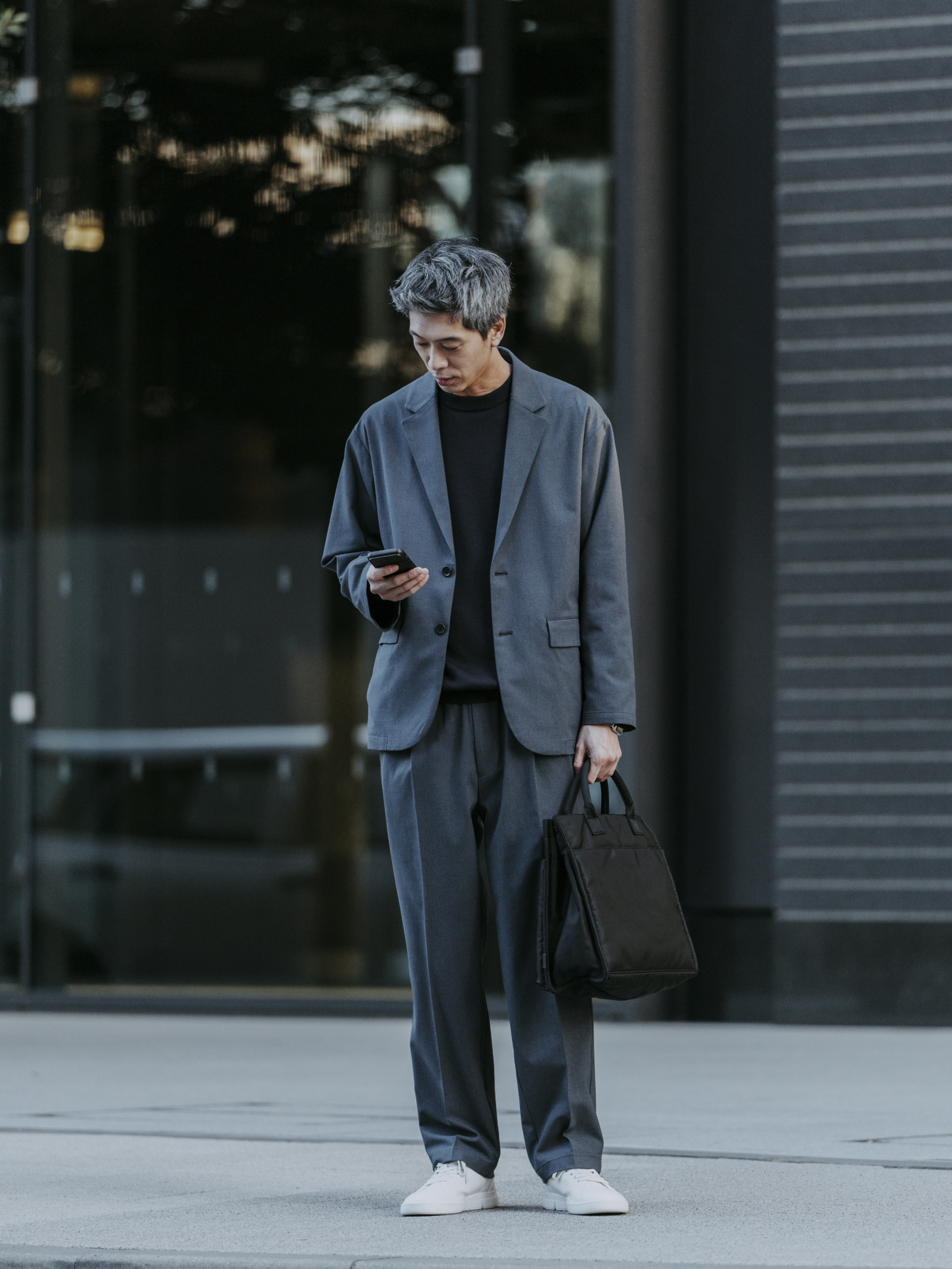 ここでは、センタークリース(折線)の入ったオルマイワイドパンツと合わせ、リラックス感がありながらも折目正しいビジネスウェアとして着こなしています。