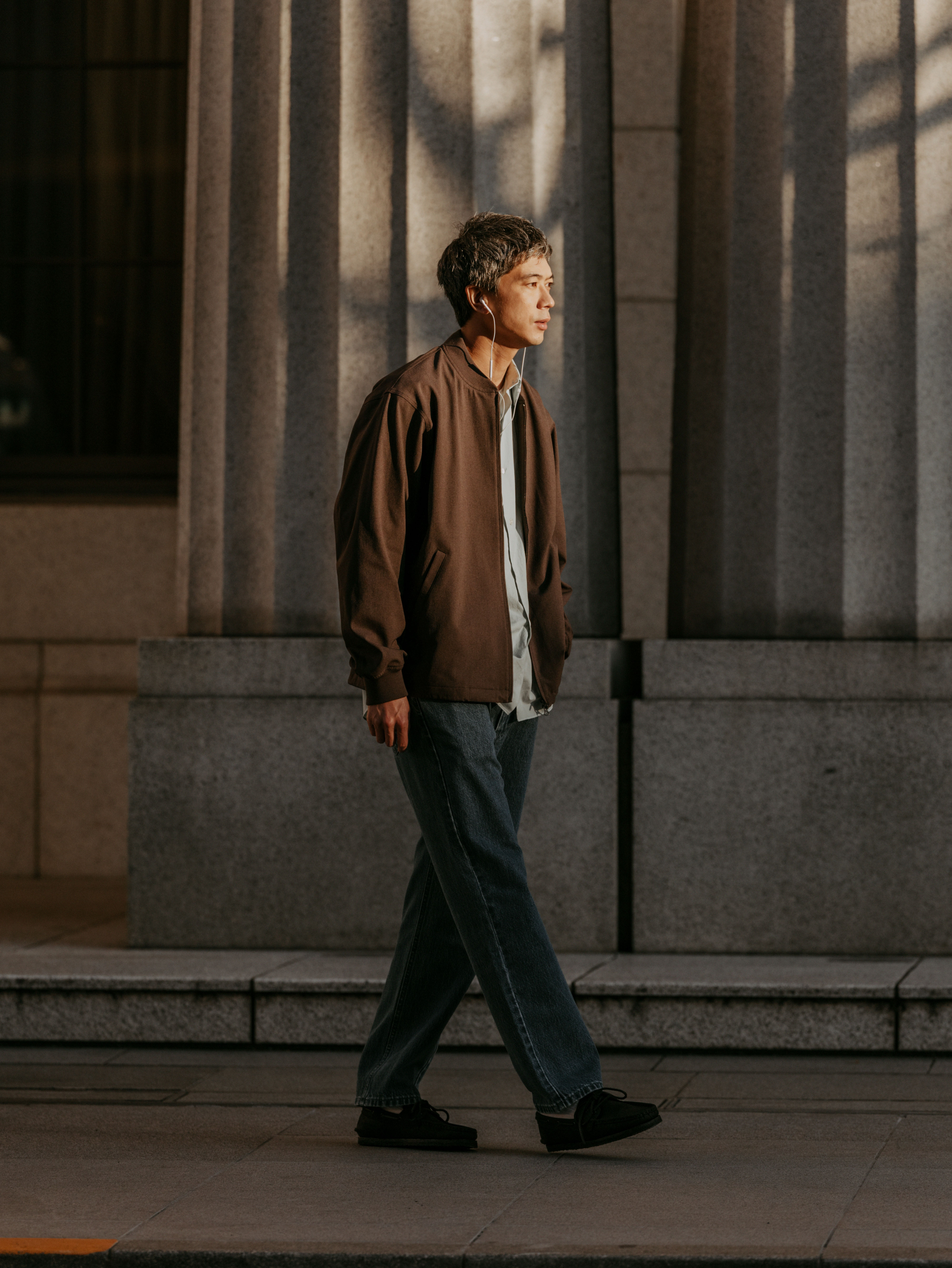 そんな着こなしには、モカブラウンのリブブルゾンが最適。ライトグリーンの無地シャツをインして、春らしさを加えながら、<リーバイス>のルーズフィットデニムとレザーシューズで大人な雰囲気も演出しました。