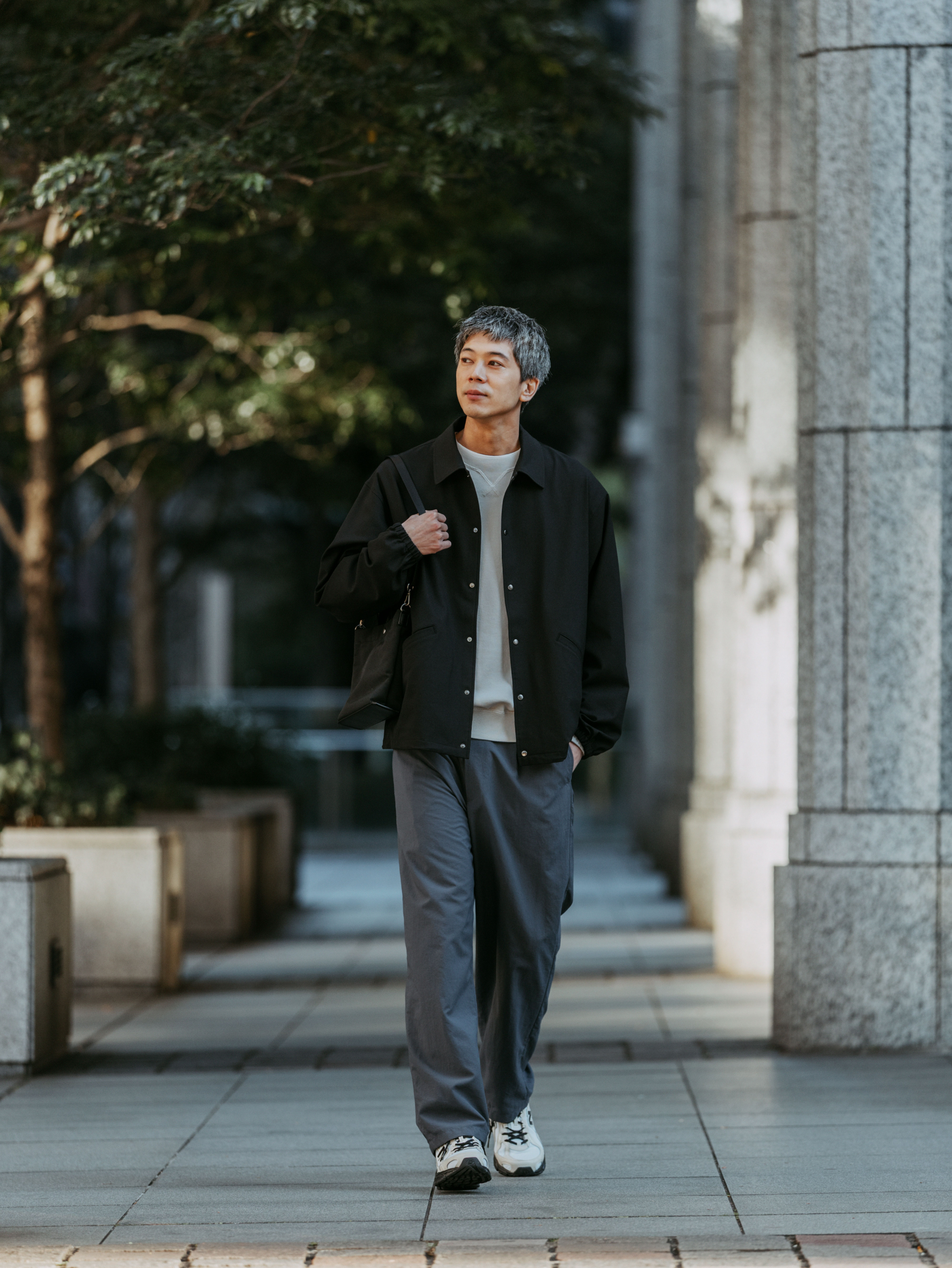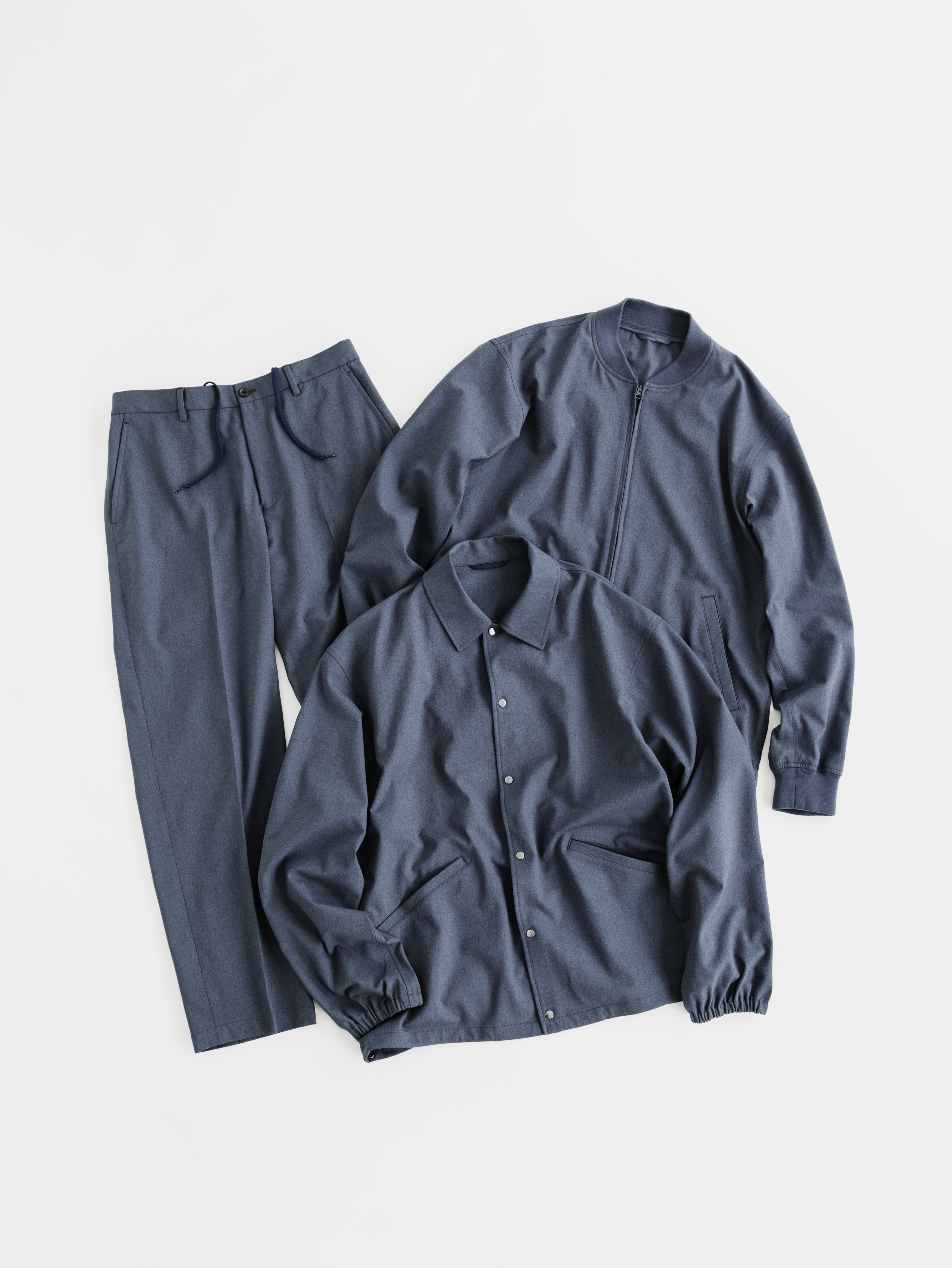 ここでは、新たに加わったアイテムのコーチジャケットにワイドなスラックスタイプのパンツを合わせ、セットアップスタイルで。コバルトブルーは、春らしいペールトーンとも相性抜群です。