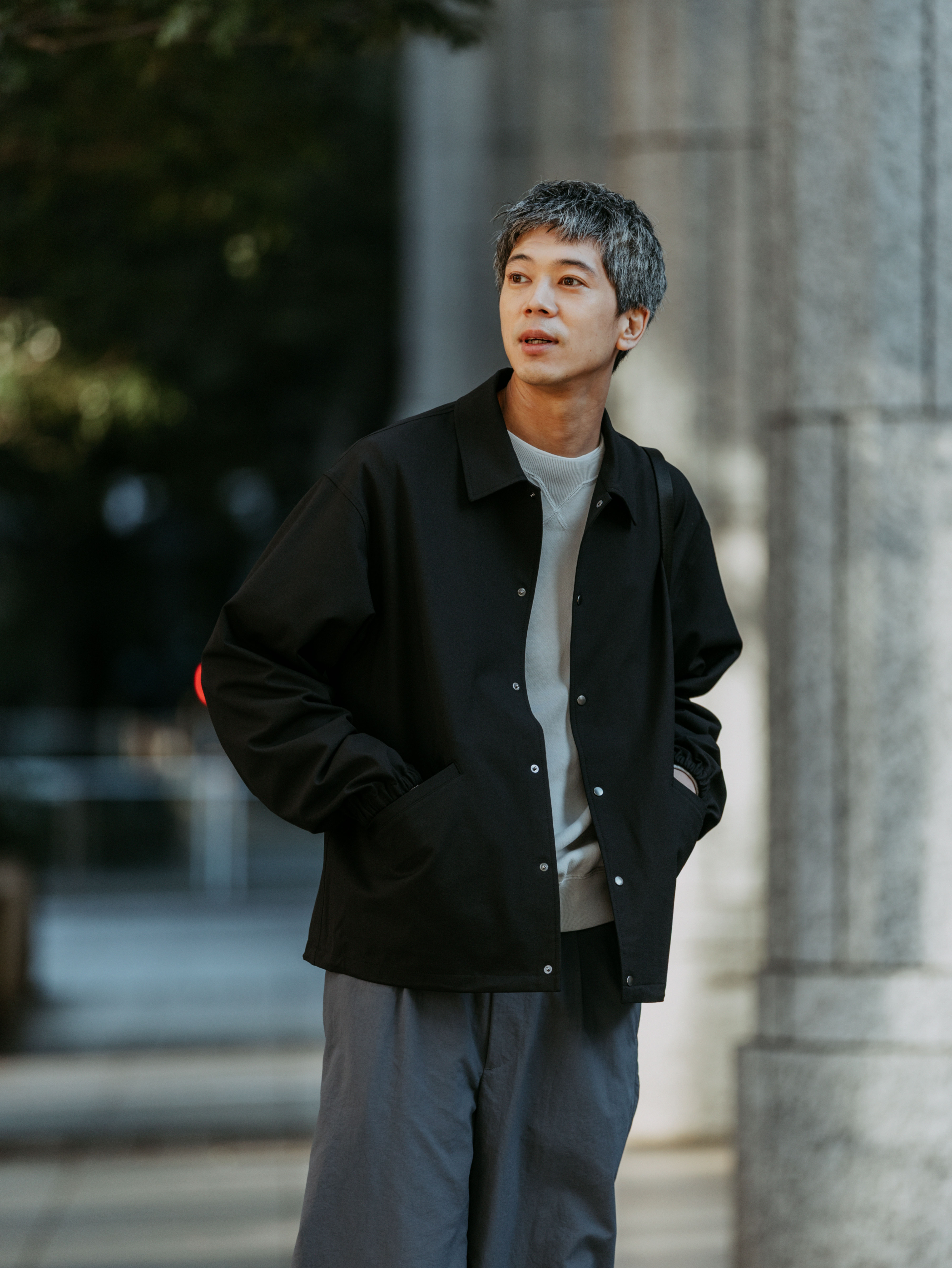 ブラックのコーチジャケットを単品使いしたこちらのコーデ。トレンド感のあるアイテムをシックな色調でまとめ、新鮮さと同時に落ち着いたムードを演出しています。