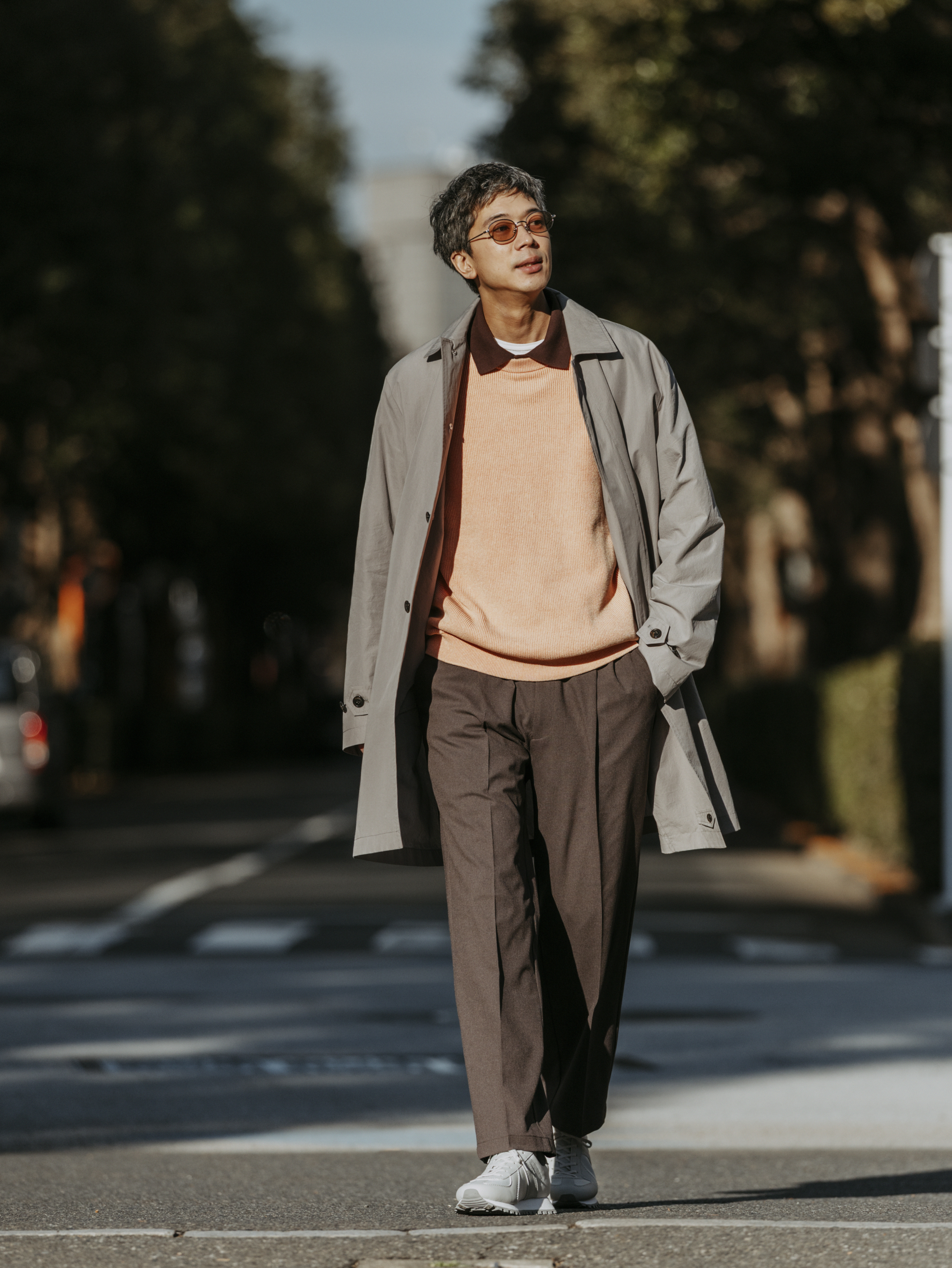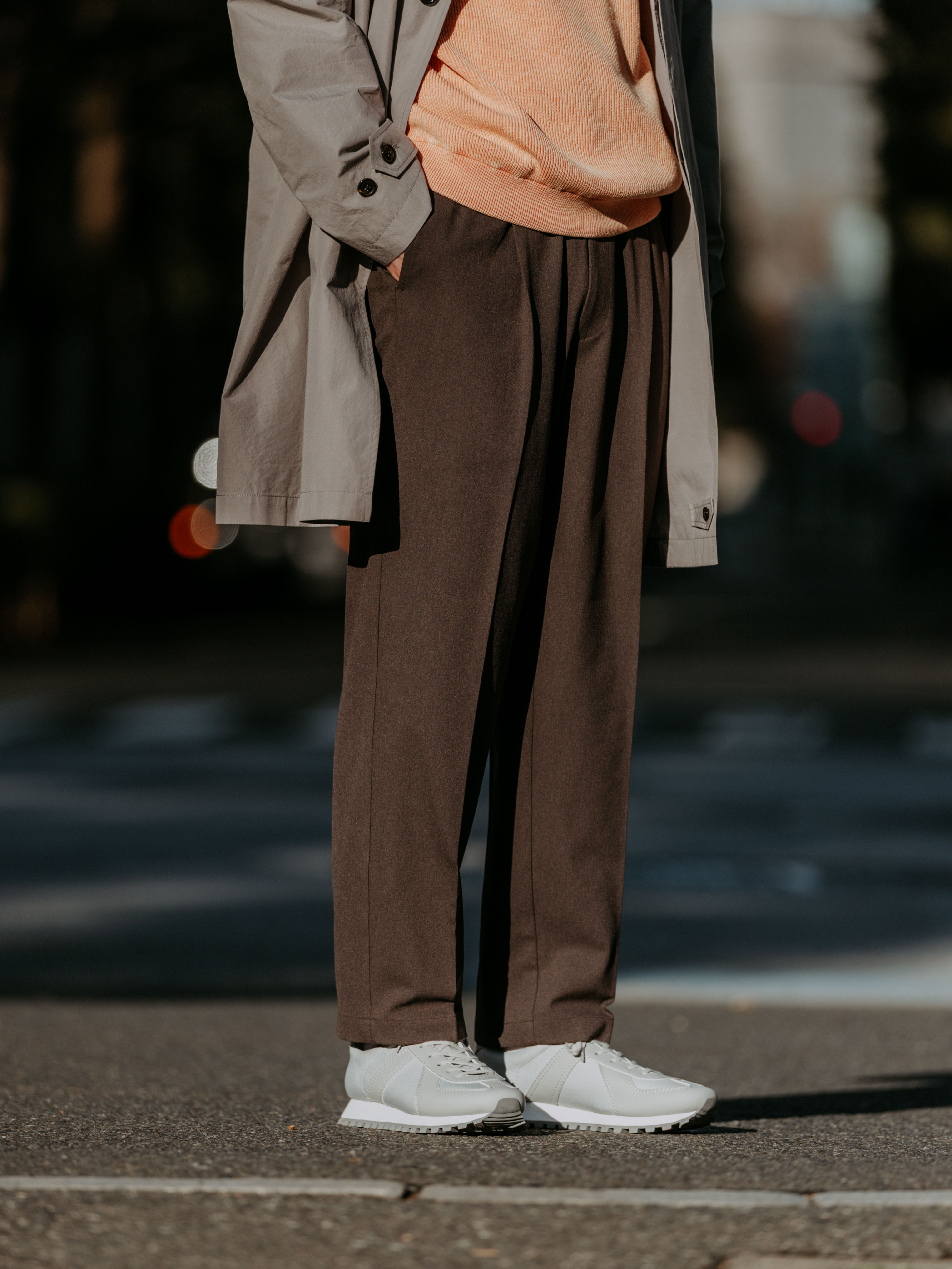 先に紹介したカジュアルアウターと、きちんと感のあるワイドパンツとの組み合わせは、コーディネイトにまとまりをもたらしつつ、ドレス感のあるビジュアルに仕上げてくれます。