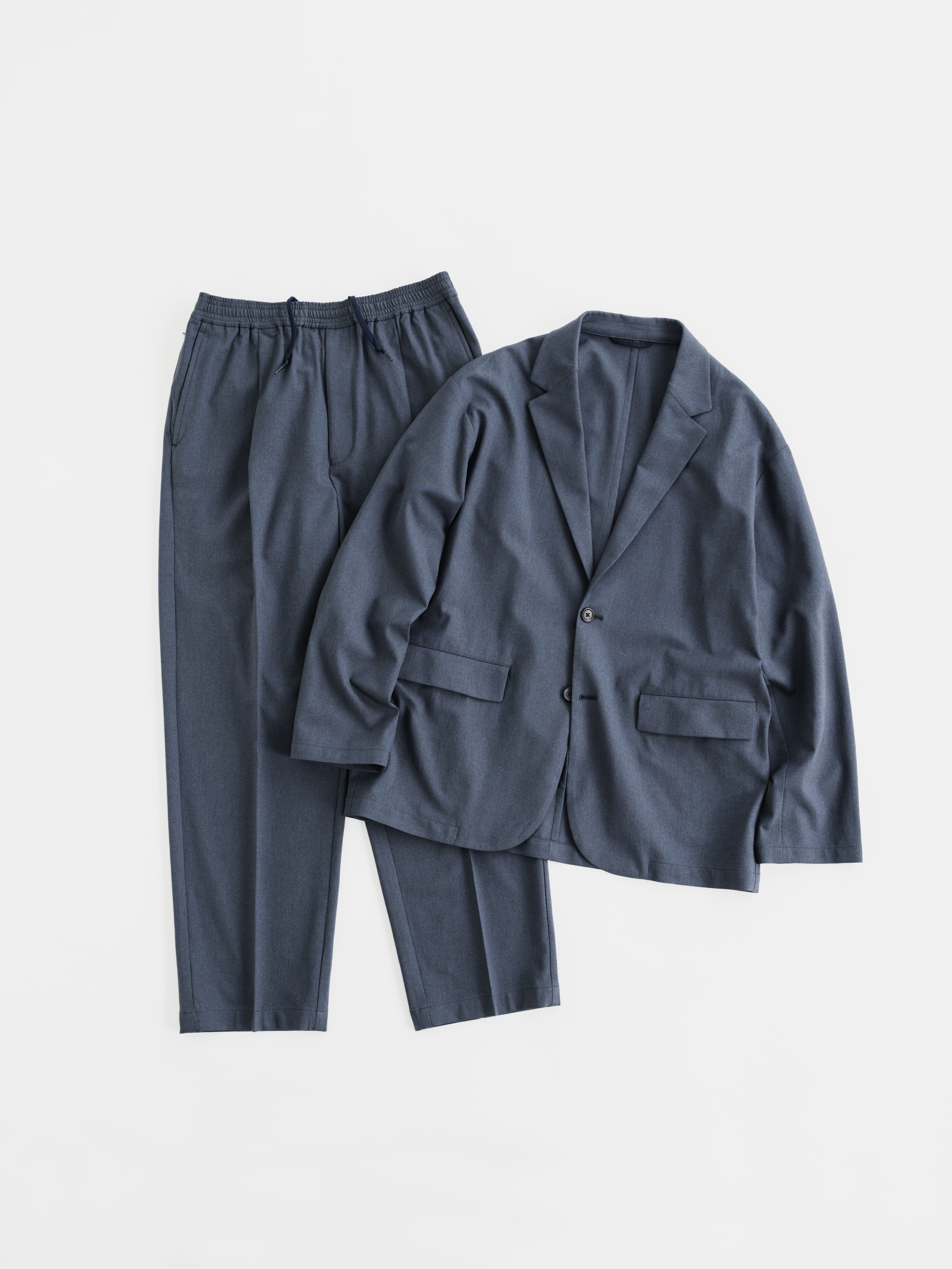 新色・コバルトブルーは、やや明るめのネイビーに見えるため、セットアップで着用した際の“ビジネス感”は十分。クルーネックのカットソーをインするだけで、心地良く、見た目も申し分ないビジネスウェアに早変わり。