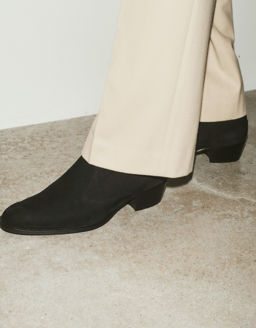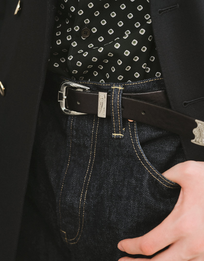 ベルトやシューズは、スタイルにおいて自分のテイストを決定付けてくれるアイテム。たとえば写真のようなウエスタン調のアイテムなら、色っぽさを助長してくれます。