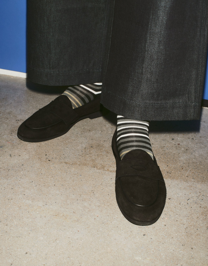 マルチカラーのボーダーソックスはジャケットスタイルや革靴との相性がいい。ワンポイントのはずしは、装いのキャラクターを立たせて華やかさをもたらしてくれる。
