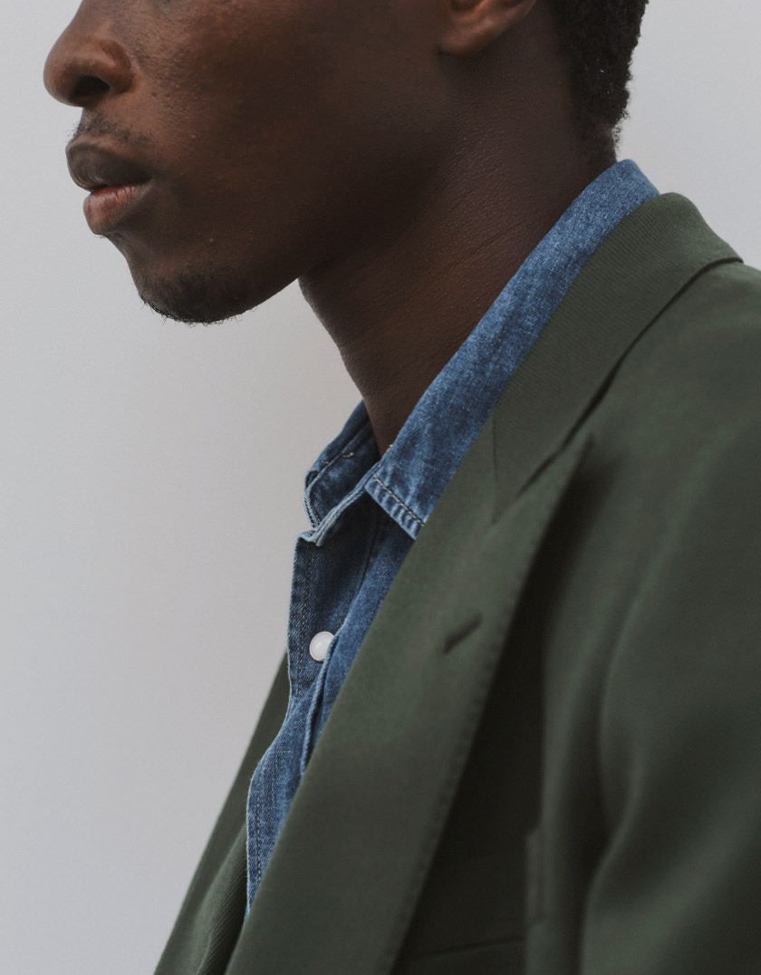 デニムシャツをインナーに合わせるのは、ジャケットスタイルの幅の広さを象徴する。同じテーラードでもスーツではなかなか出来ない合わせが楽しめるのもジャケットの魅力。