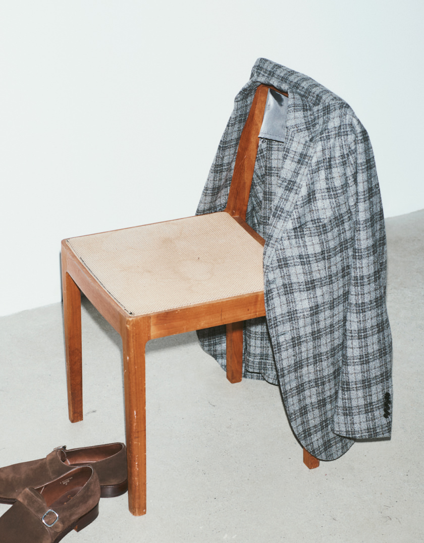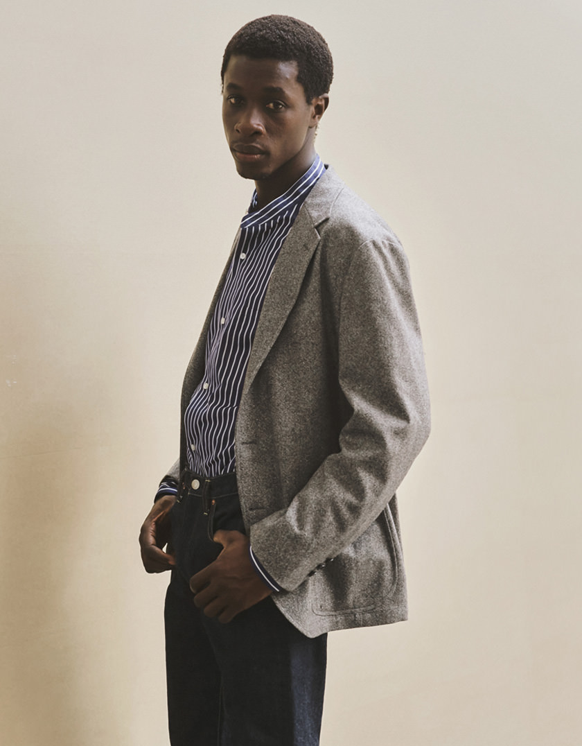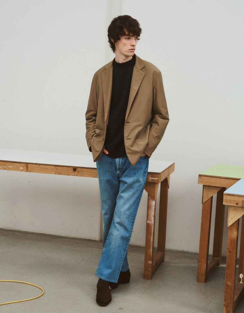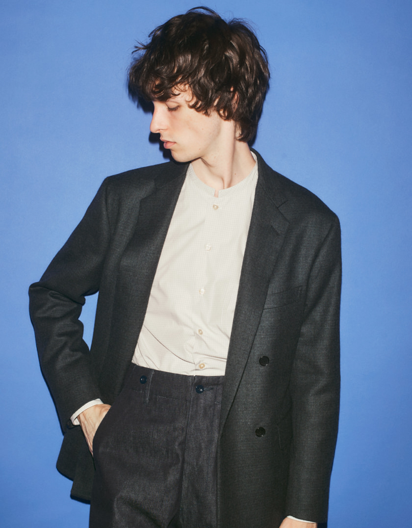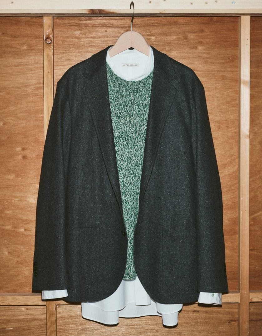 ざらっとした質感と素朴な雰囲気が特徴の、ホームスパンを使用したオリジナルのジャケット。品の良さは保ちながらも、自由な合わせで着ることを前提としたモデルで、胸ポケットも省いています。クラシックな雰囲気を軽い着心地で楽しむのも今季らしい。