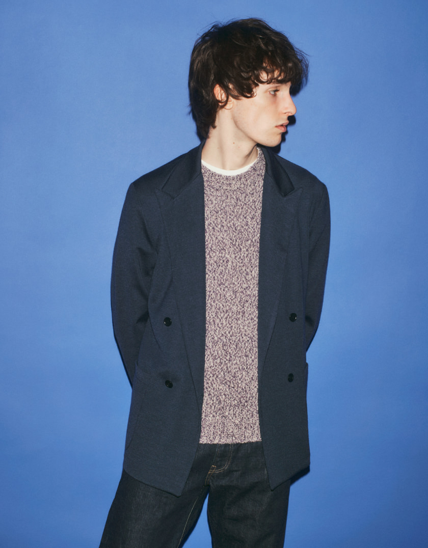 楽さを求めるならこのジャケットがおすすめです。ウールとアクリル素材のニット地で、まるでカーディガンのような着心地とダブルならではのボリューム感を兼ね備えています。