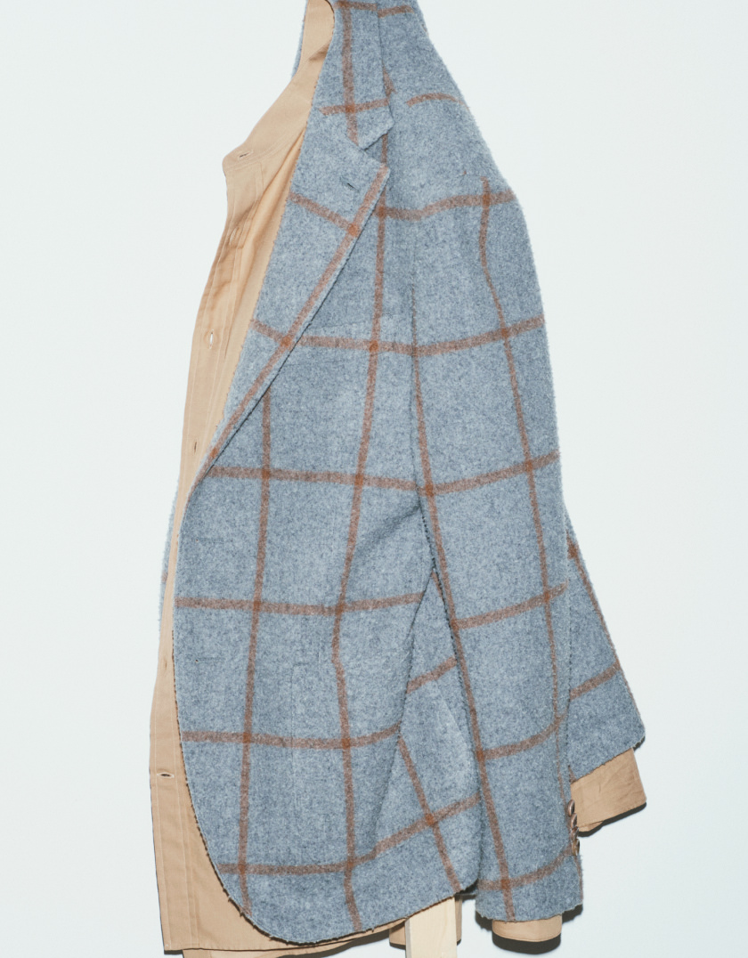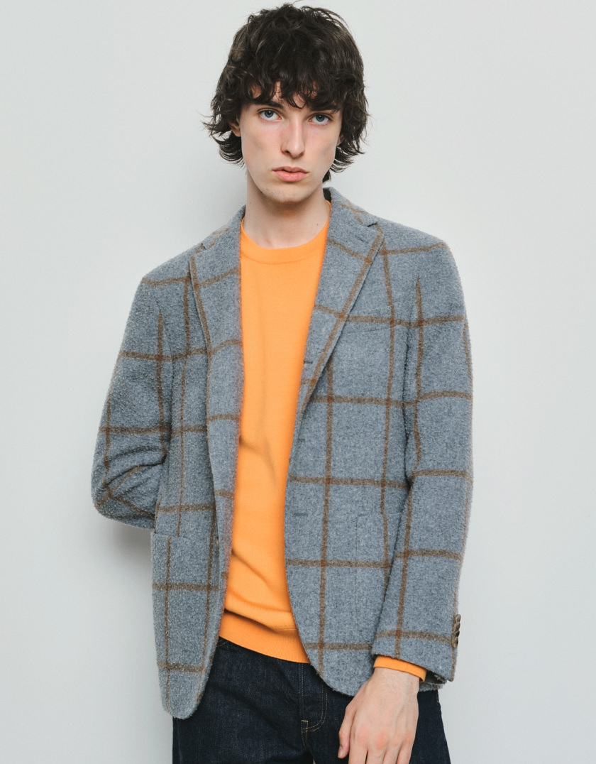 ブークレ生地を使用した独特な表情を持ったチェックジャケット。モノトーンの柄の中にさりげなく茶系のペーンを配色しており、深みのある表情が特徴です。こちらも先ほどのジャケット同様にタイドアップからリラックスまで様々なスタイルに対応します。