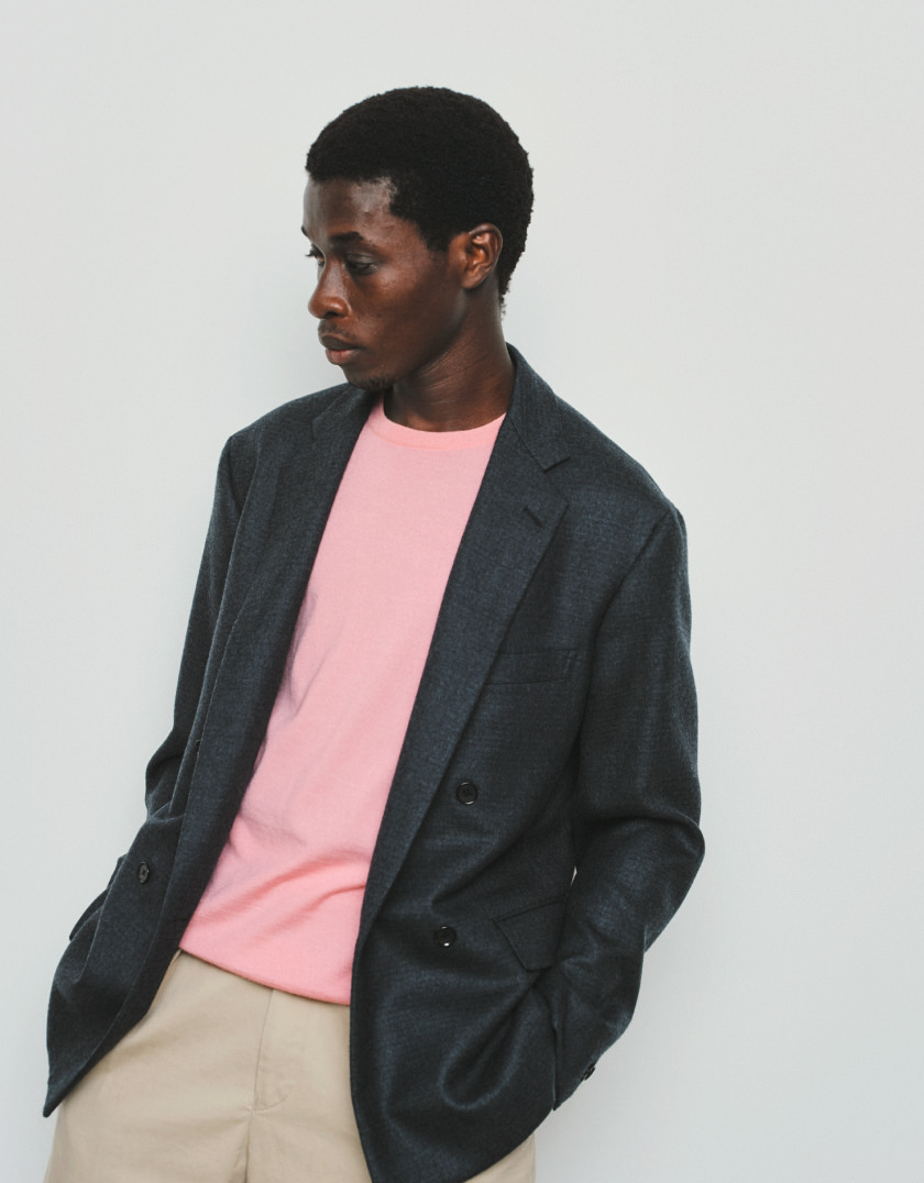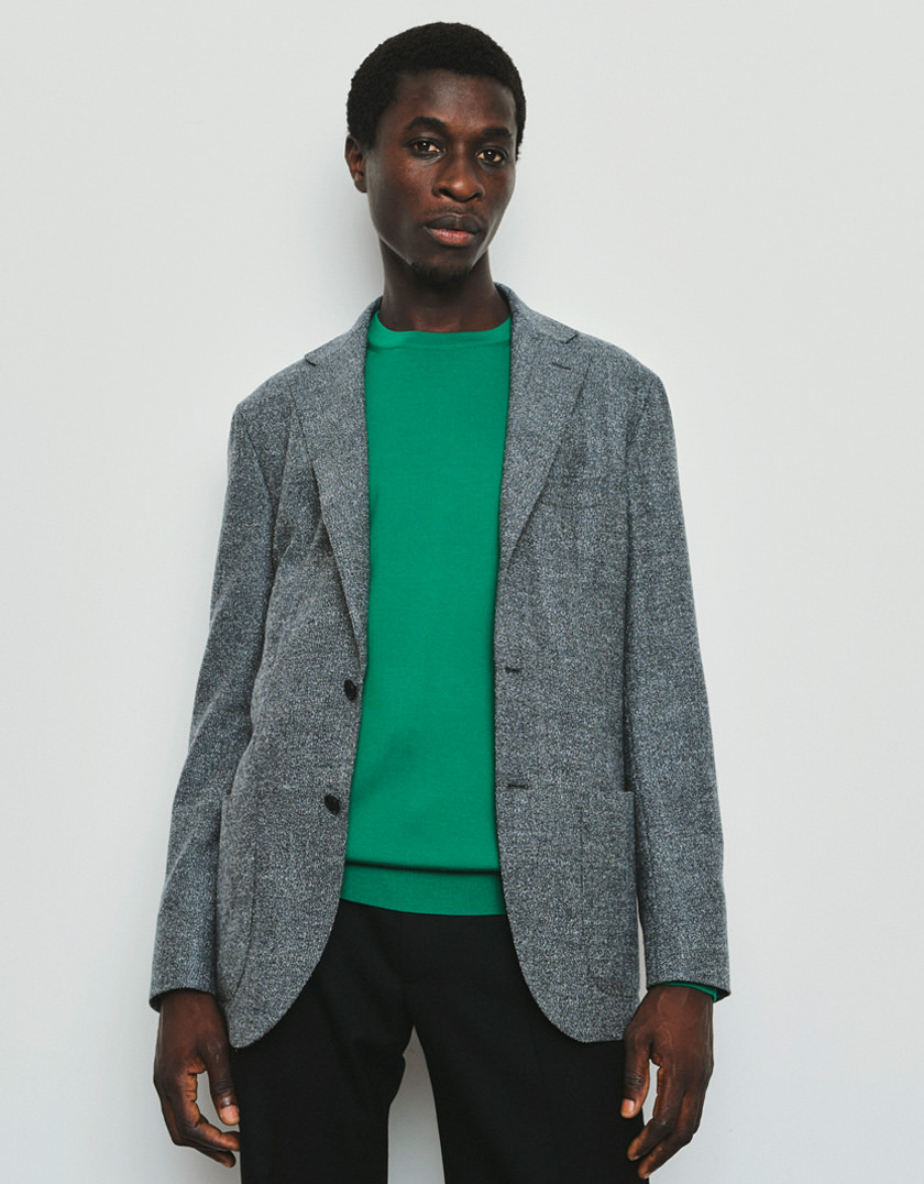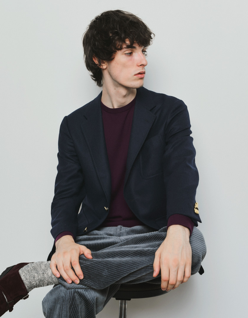 柔らかくボリュームのあるウールを用いた<カモシタ>のジャケット。やや広めに設定した肩、ノッチドラペル、ボックスシルエットで、程よくリラックスしたムードがでます。