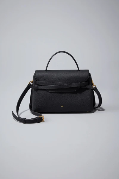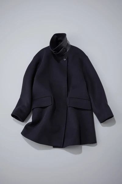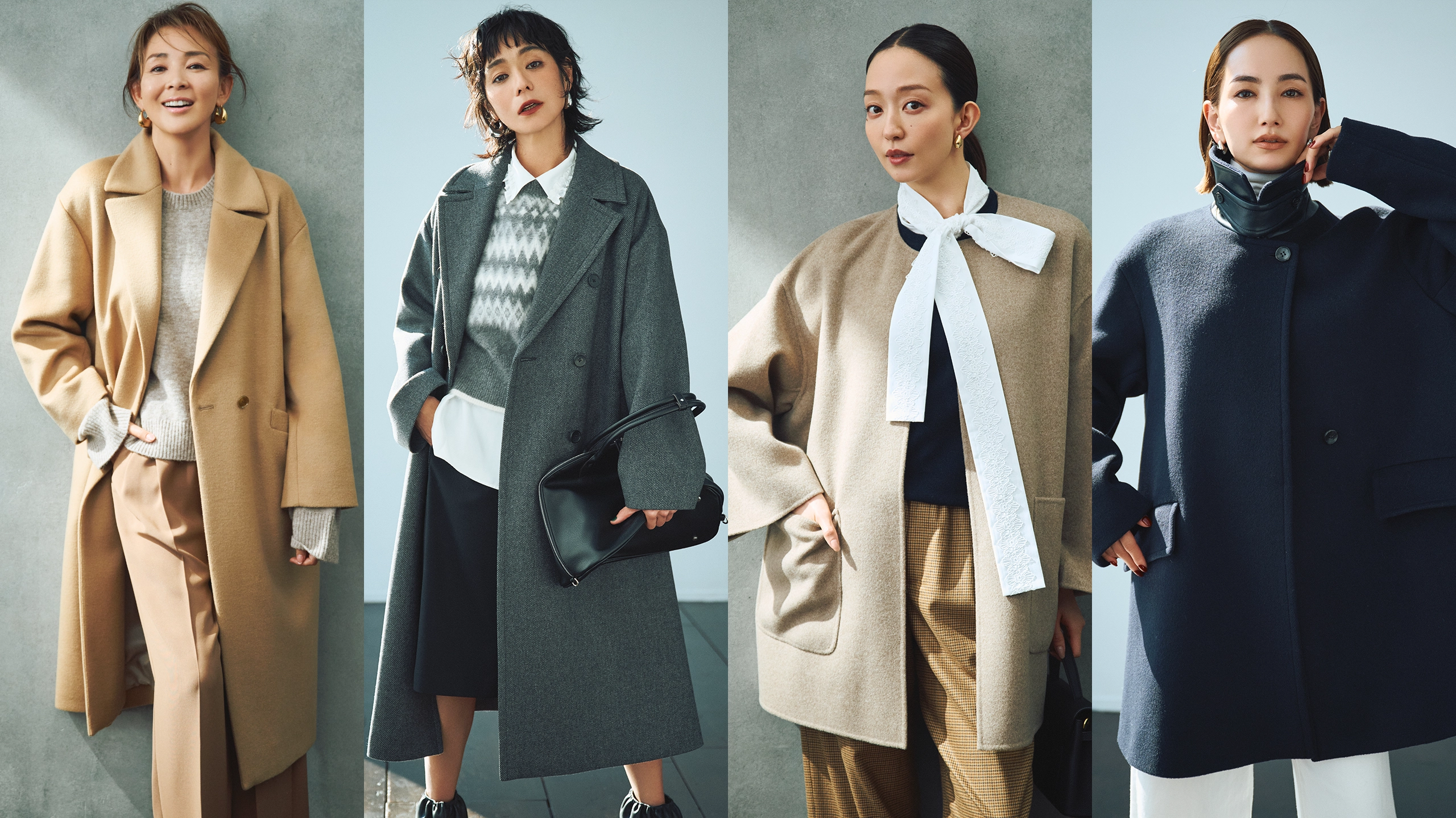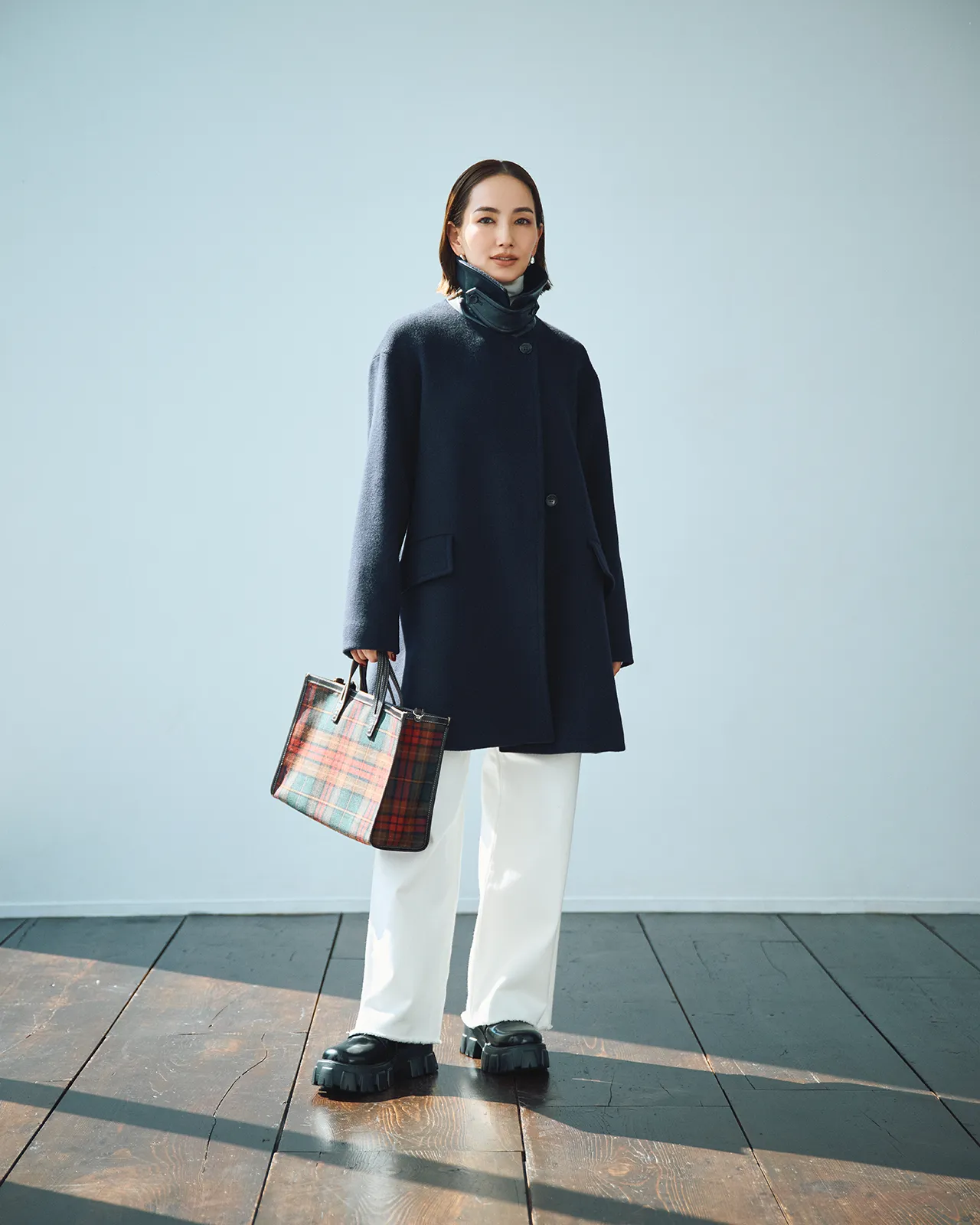 裾に向かって広がるテントラインのミドル丈コートは、どんなスタイルにも合わせやすい定番型。それでいて、襟を立ててチンストラップで留めればガラリと印象の違う横顔美人に。ネイビーのコートには冬のホワイトを合わせてクリーンなスタイルで。