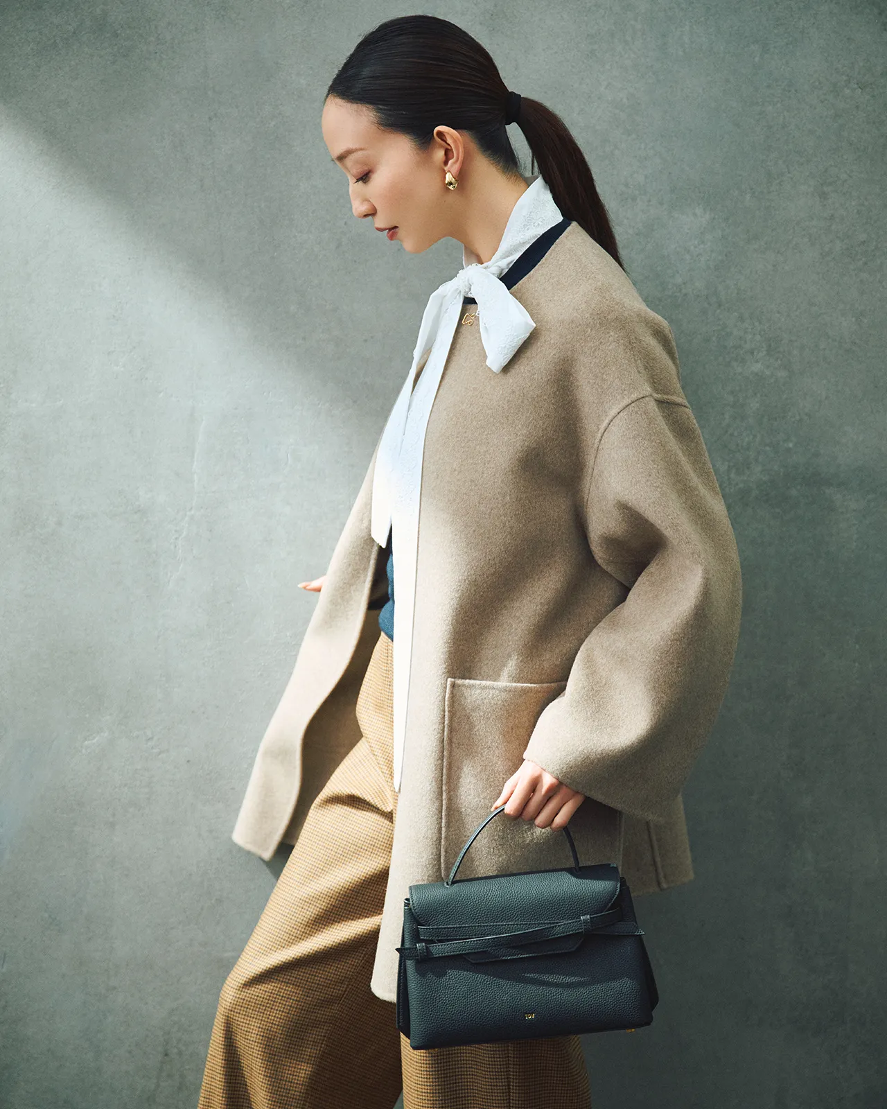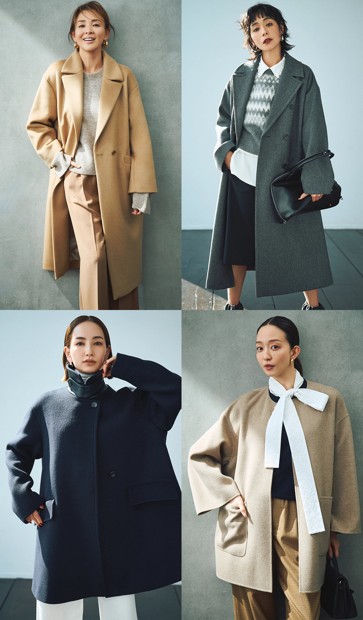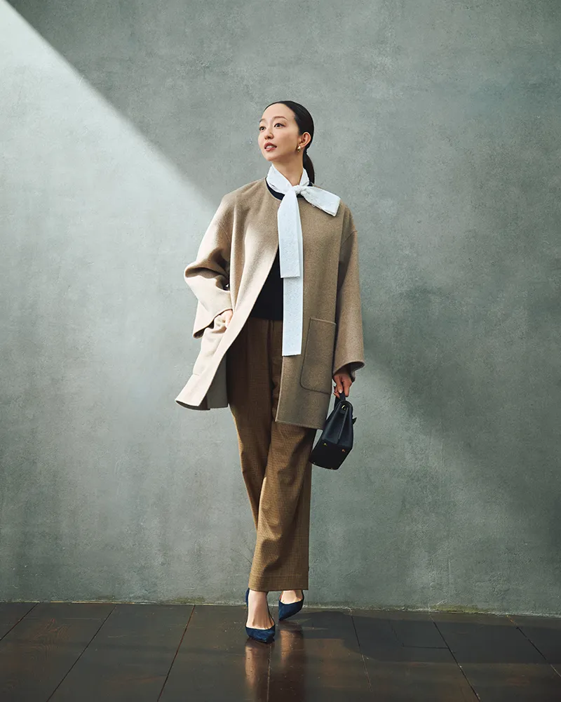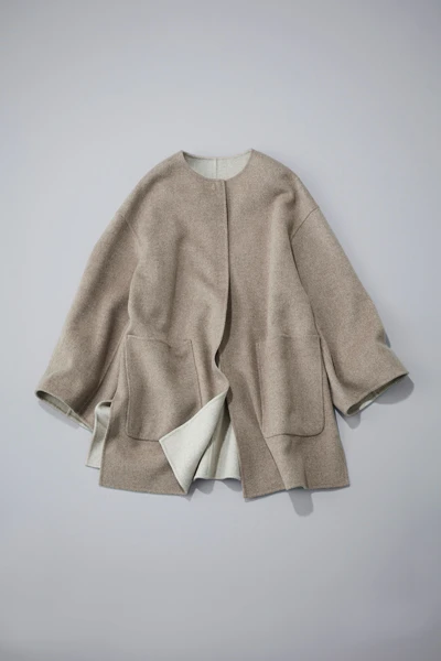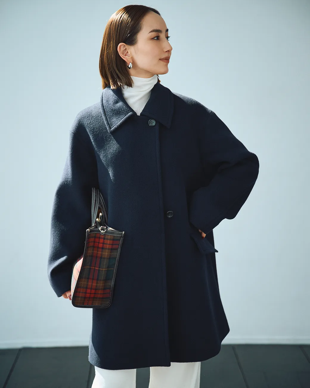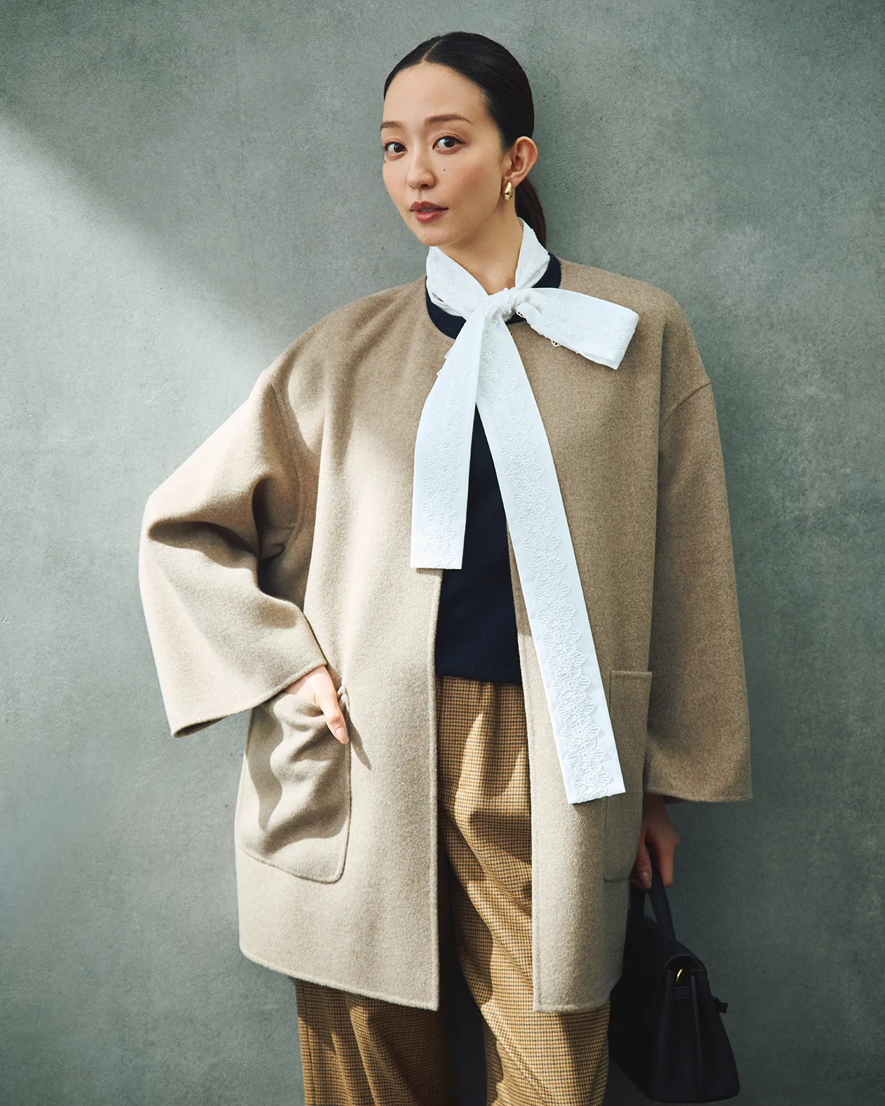 季節に合わせてインナーをアレンジしやすいマント風のリバーシブルコート。人気の理由は、ストールを羽織っているかのような軽やかさ。ノーカラーの首元にボウタイを覗かせるなど、自由な着こなしを楽しめます。
