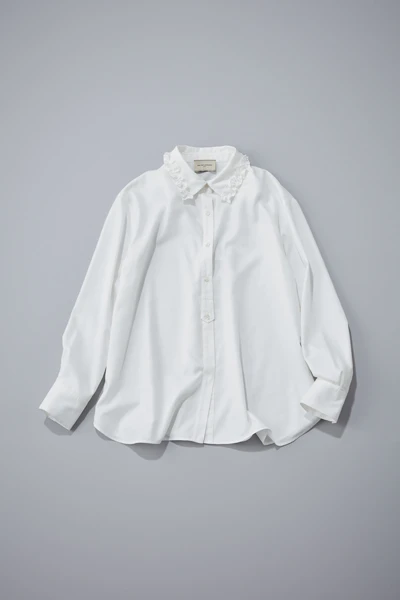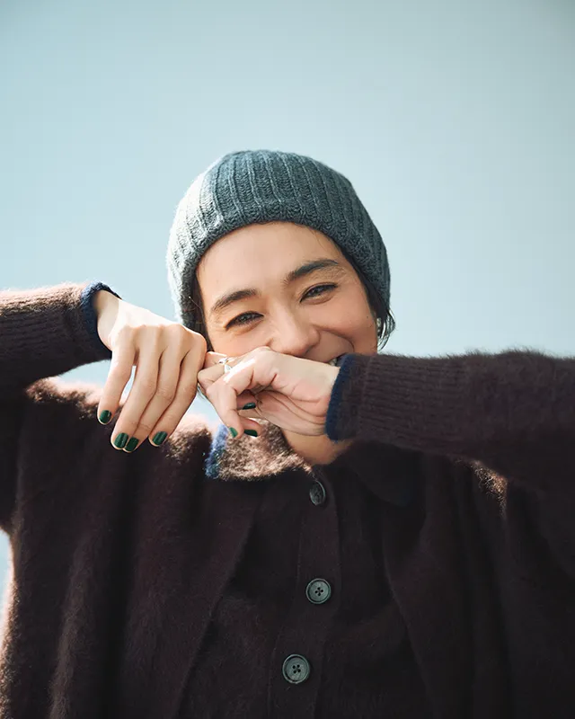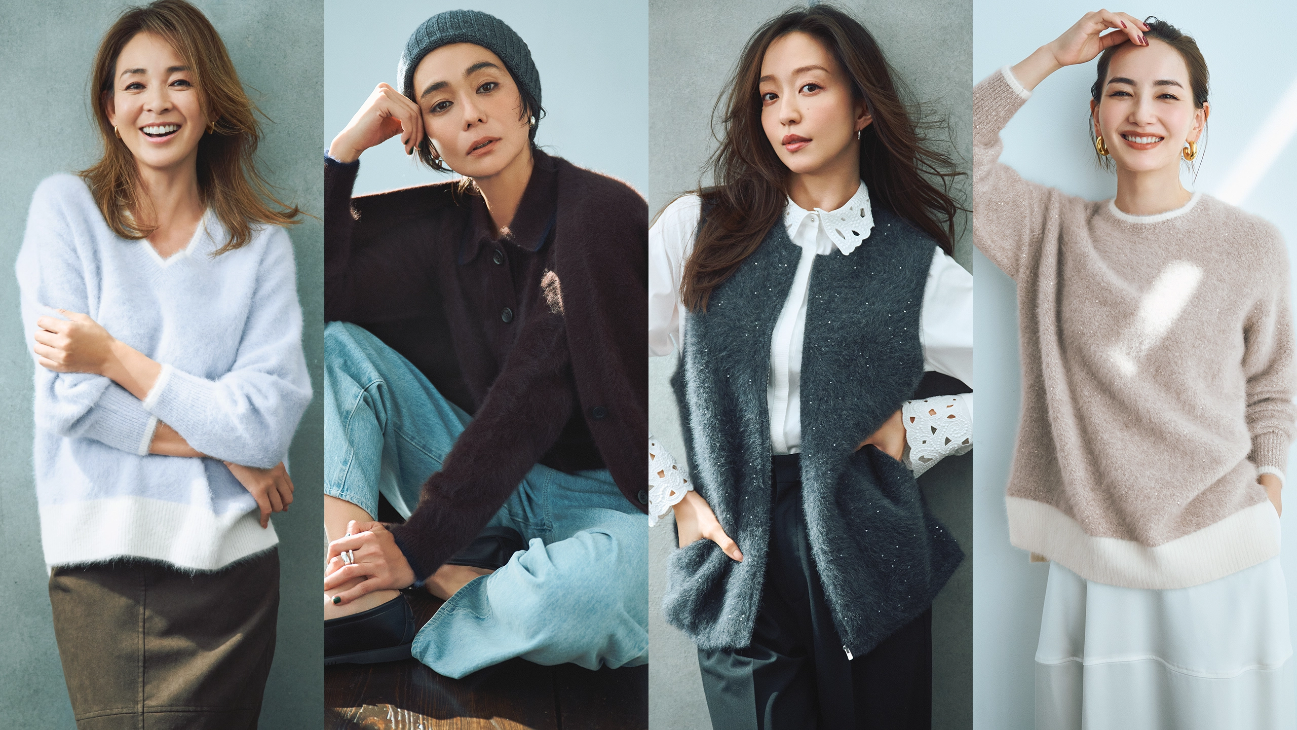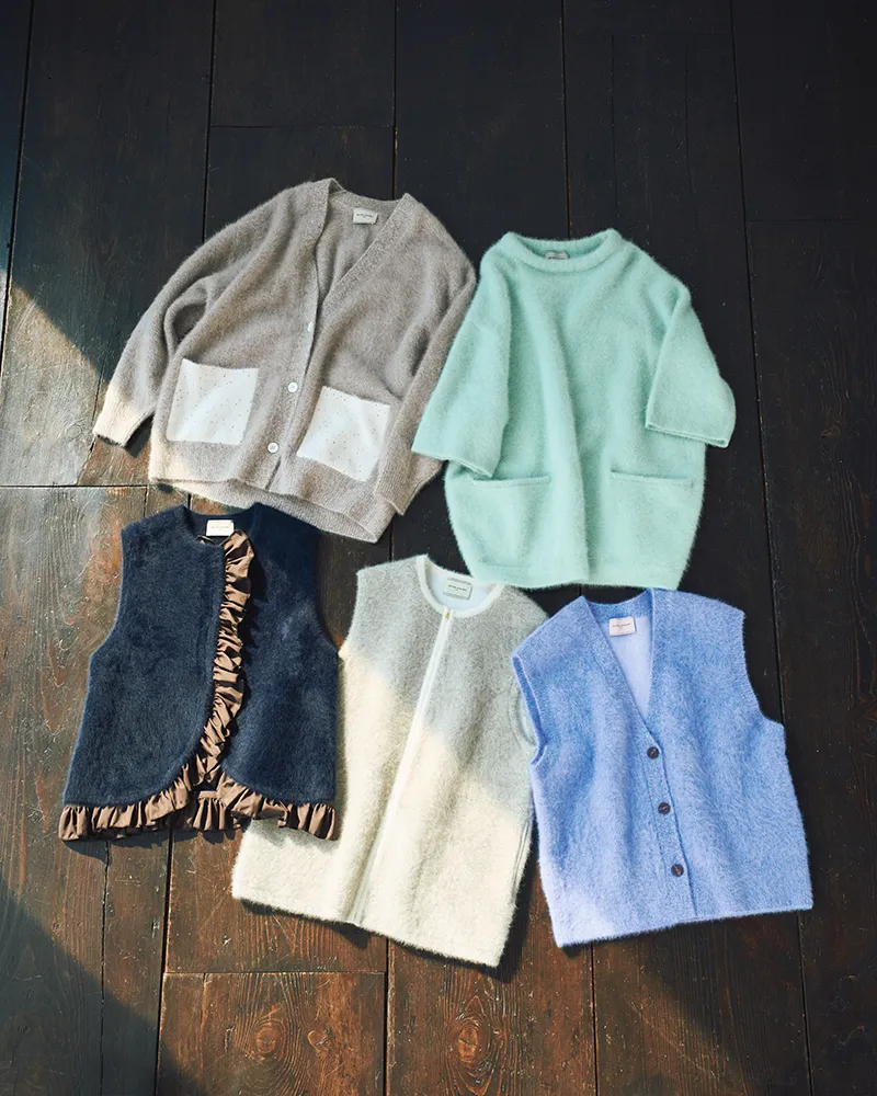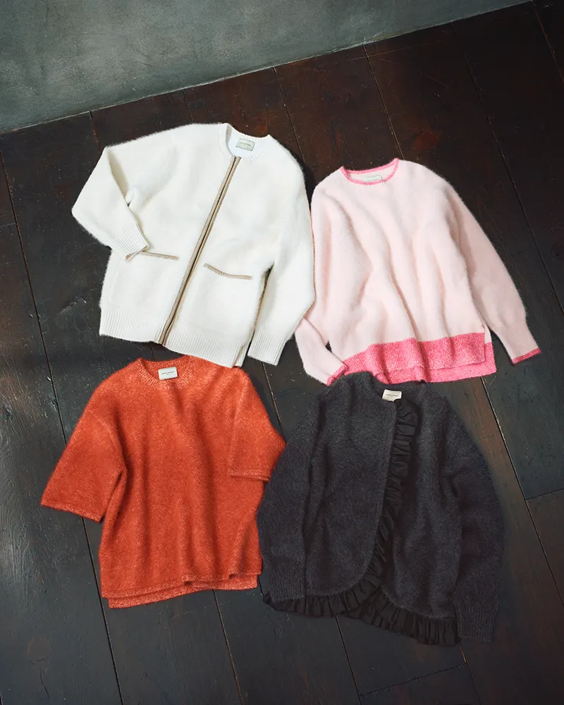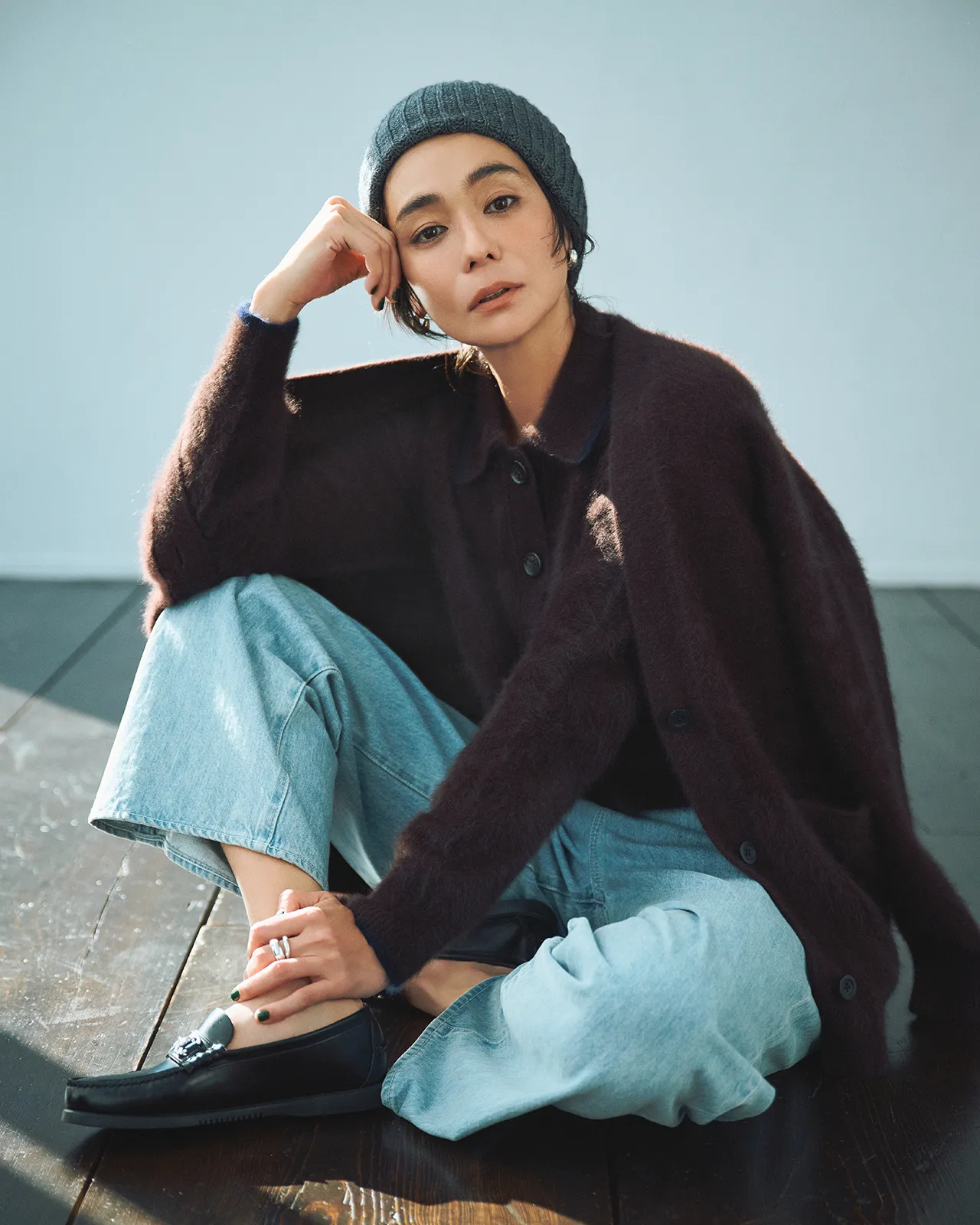 フォックスカシミヤのふんわりとした風合いを生かした襟付きのポロニットに程よいゆとりと丸みのあるシルエットのカーディガンをレイヤード。同素材を重ねるアイディアで、デニムのカジュアルコーデがランクアップ。
