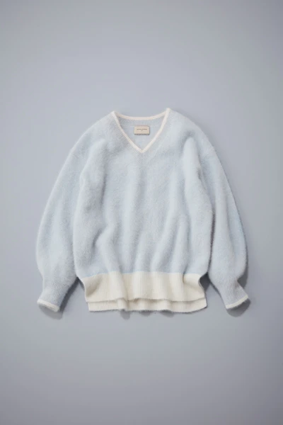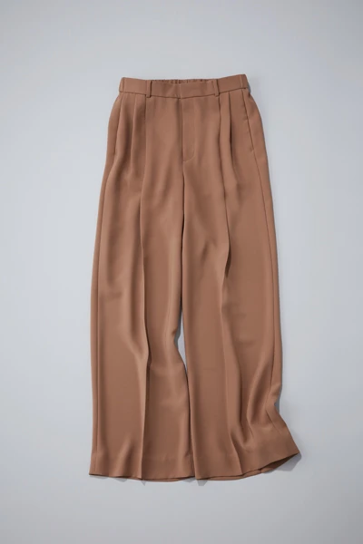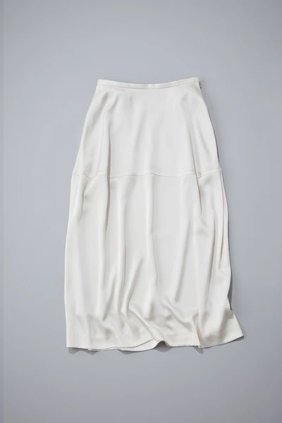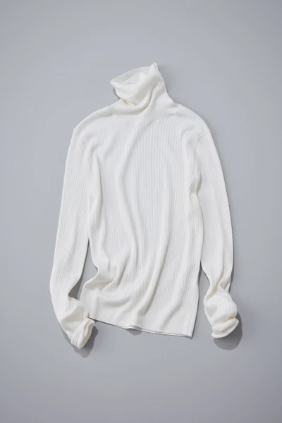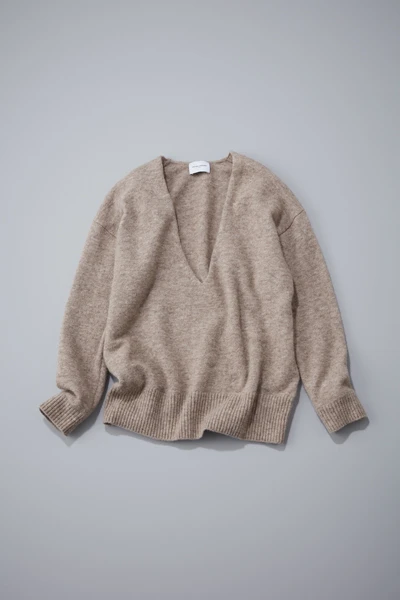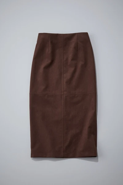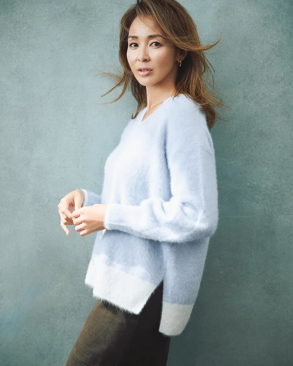 デコルテを綺麗に見せる、絶妙な開きのVネックデザインのニット。サイドのスリットがシルエットにニュアンスを作り出し、スウェード見えスカートとのシンプルな組み合わせだからこそ魅力が引き立つ、フォックスカシミヤ。