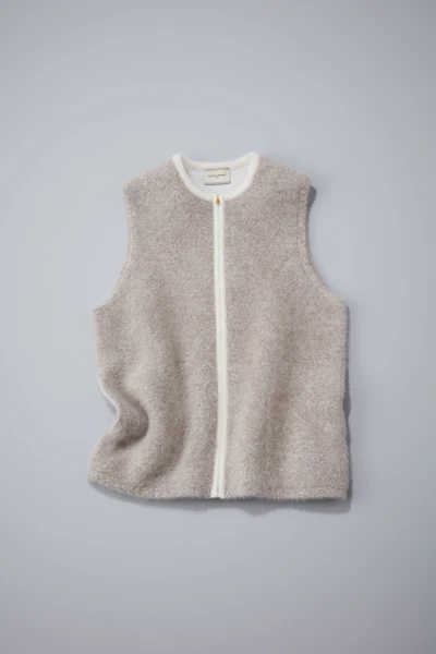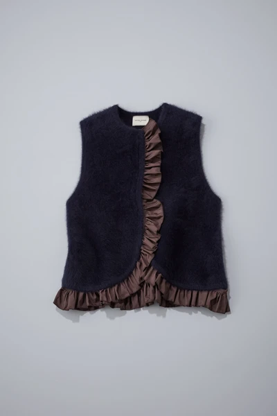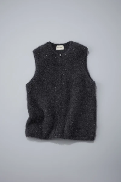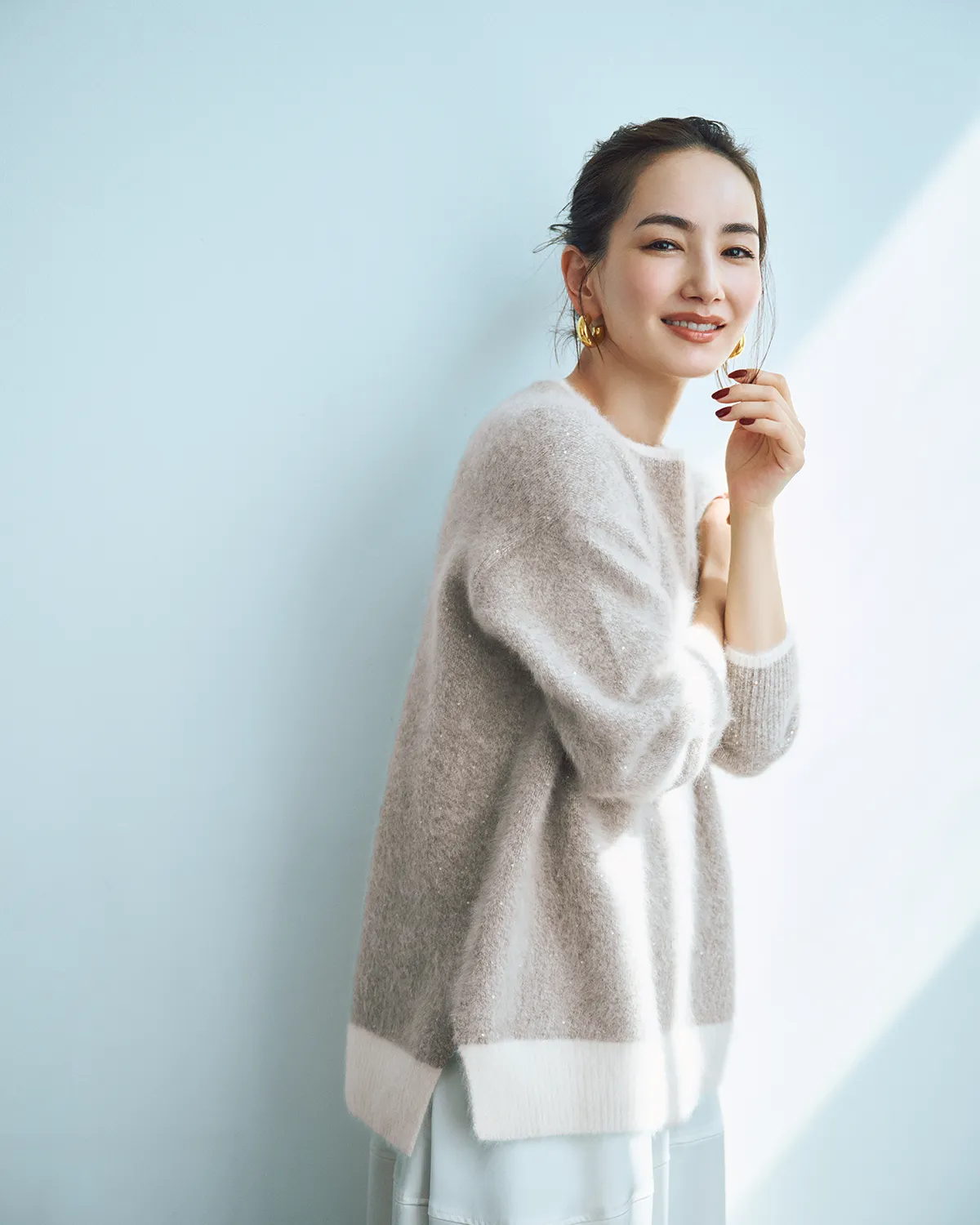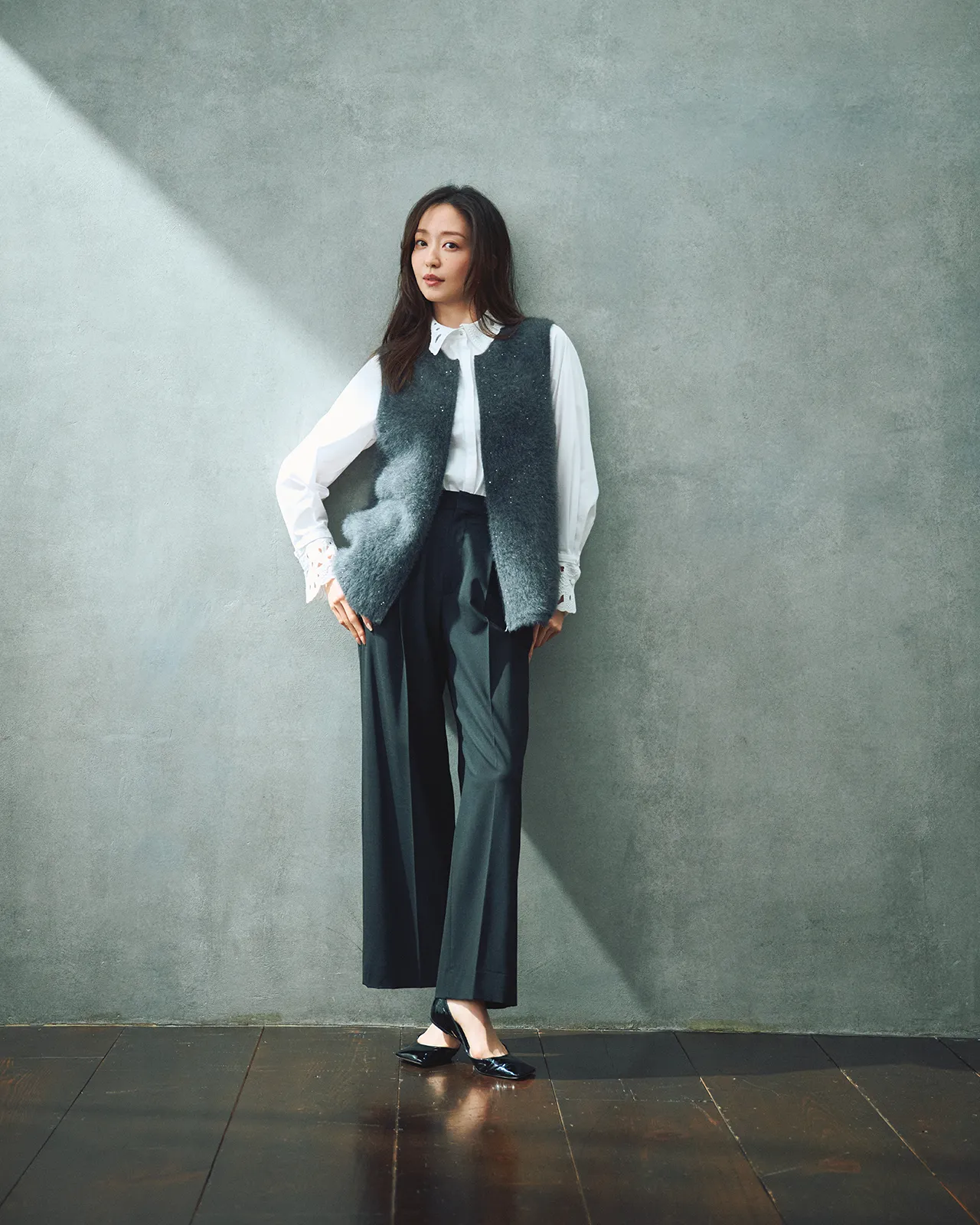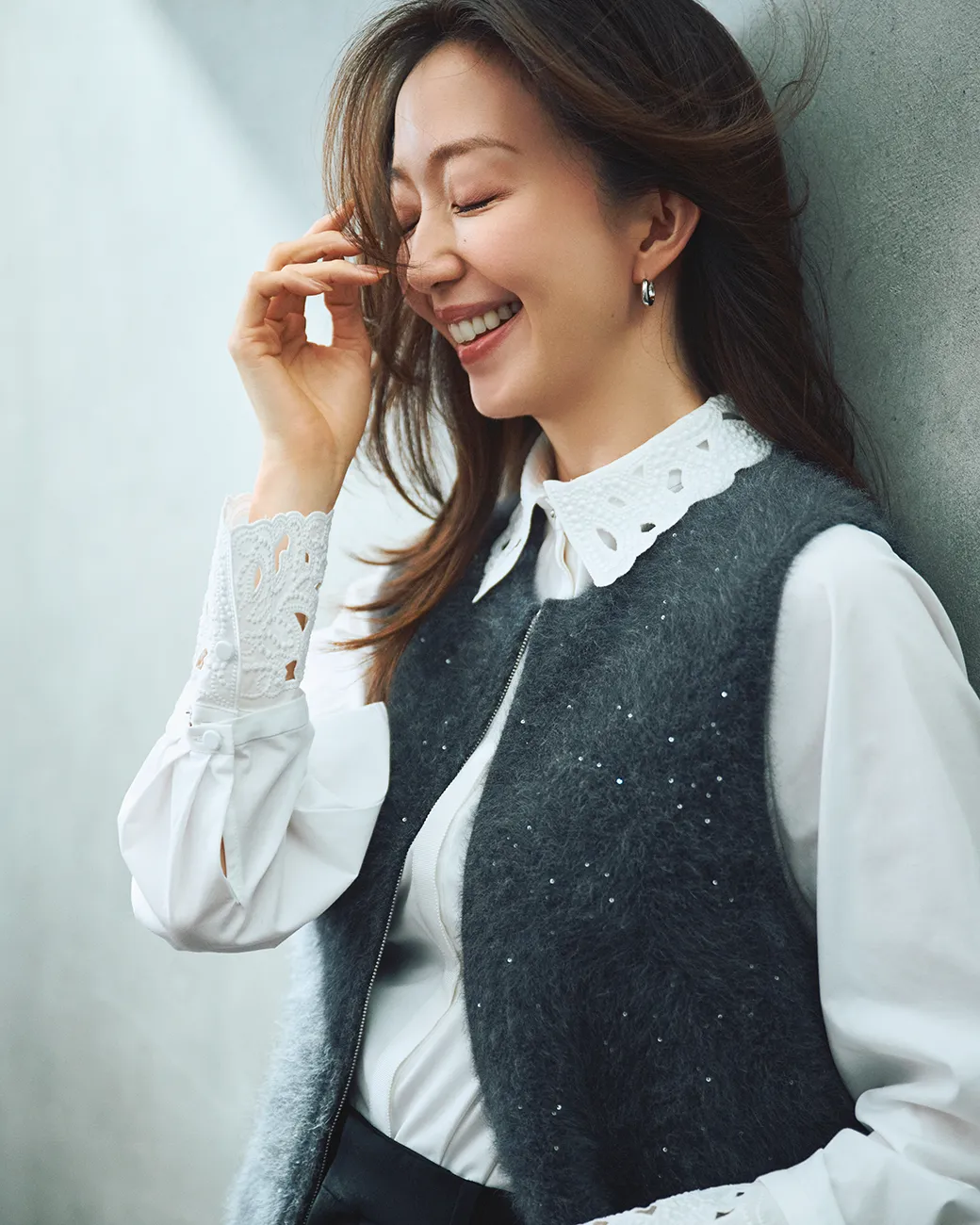ONシーンにおすすめなのはボックスシルエットのニットベスト。フォックスカシミヤのふんわりとした毛足に散りばめたスパンコールの煌めきは、いつものパンツスタイルに羽織るだけで華やかさが格別なものに。