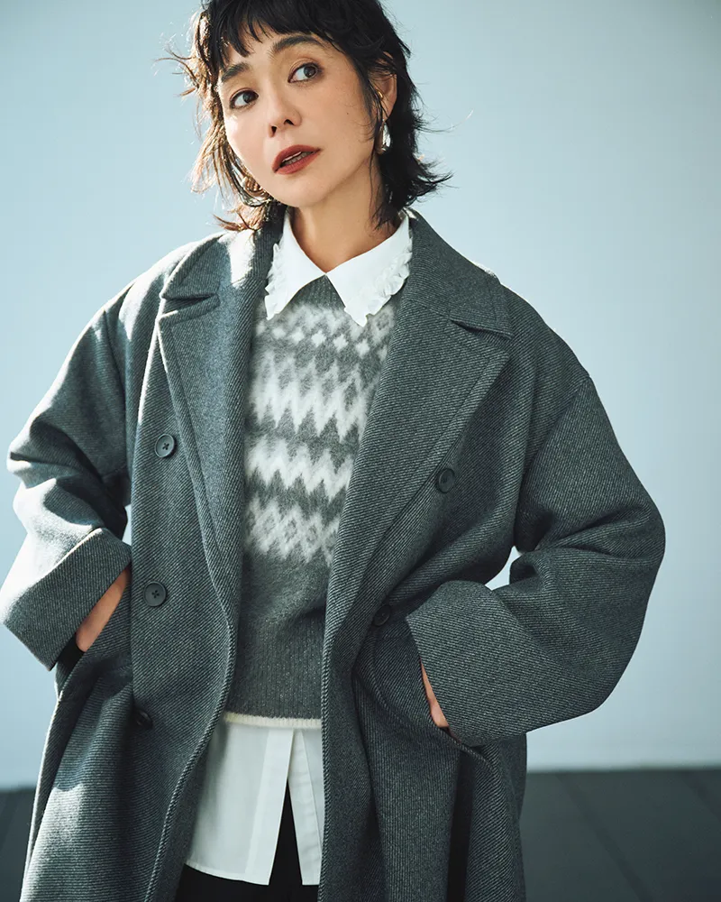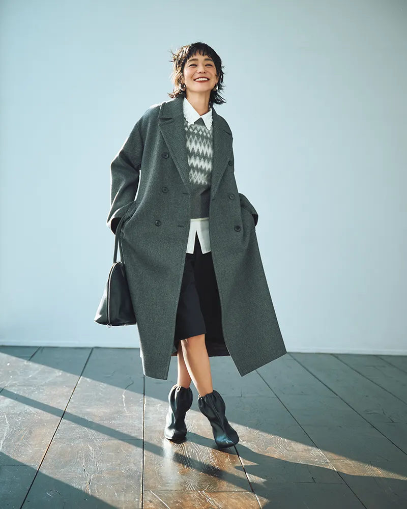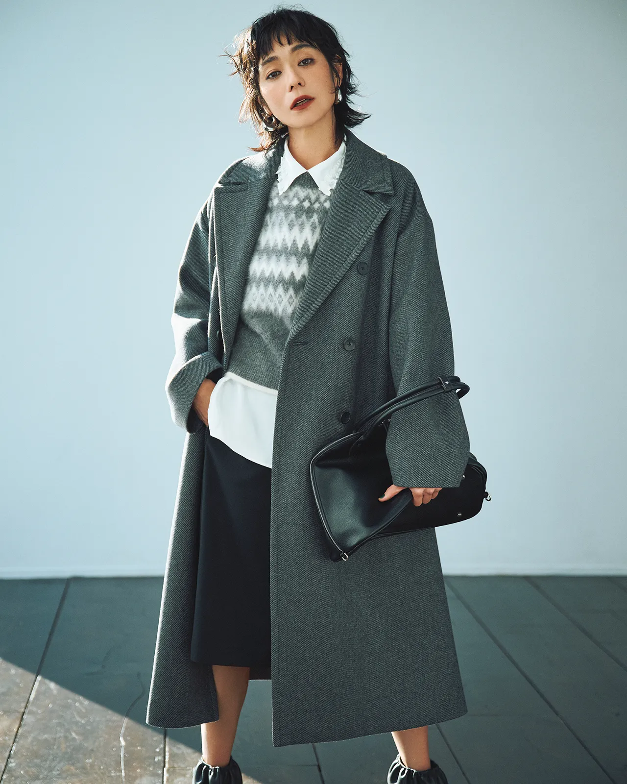 メンズライクなダブルのテーラードコートは、立体的なシルエットで後ろ姿も素敵。ハーフパンツのトレンド感あるコーディネートに合わせるなら、コートはあえて流行にとらわれないベーシックなものを選んで、おしゃれ上級者を目指したい。
