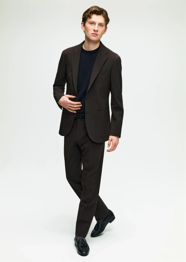 ウールにポリエステルを複合させたシアサッカー素材で作ったセットアップは、