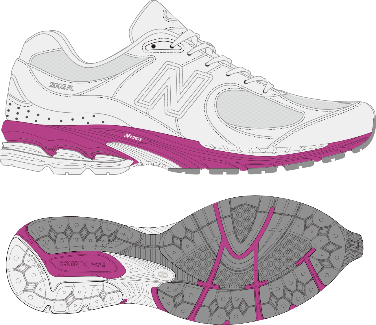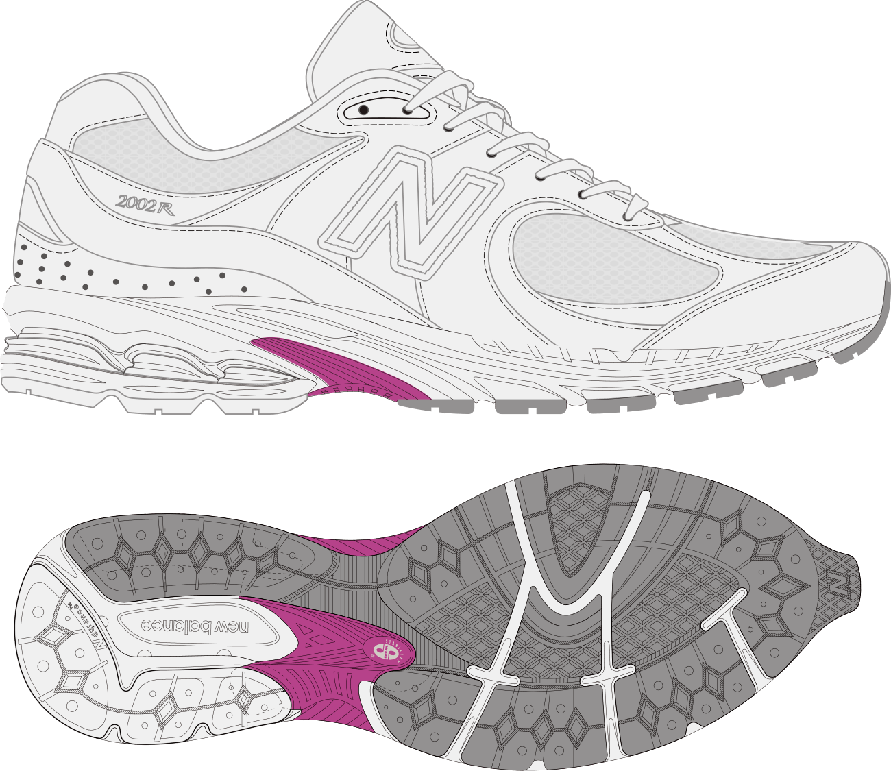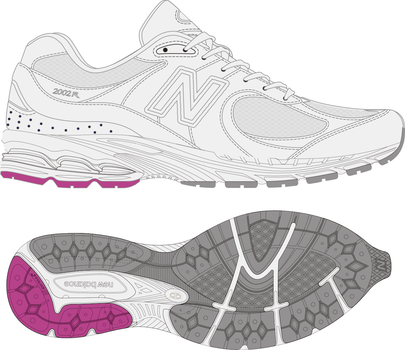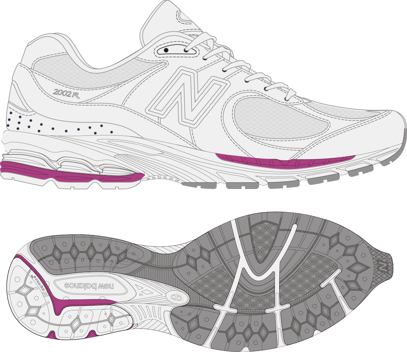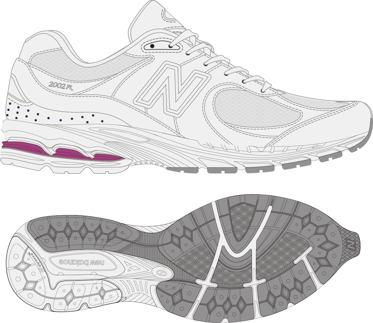 「2002R」オリジナルが持つ特徴的な重厚感を実現しつつ、アッパーには上質なライトグレーのヌバックとホワイトのメッシュをベースにクリーンな印象し、ニューバランスを象徴するサイドの “Nロゴ” など随所に使用したパープルをポイントに、より軽快で都会的なデザインに仕上がりました。