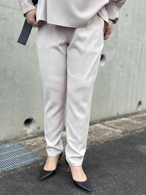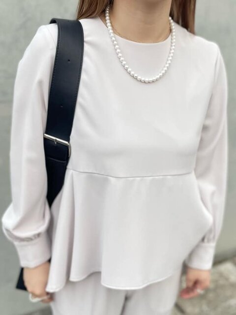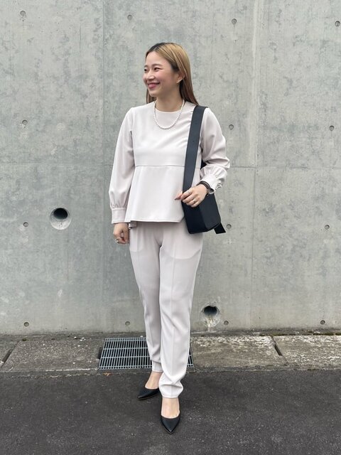 ボリュームのあるペプラム切り替えで女性らしさを出したブラウスとシンプルなパンツのセットアイテム。ブラウスは袖口にパール調のボタンがポイントです。パンツはウエストゴム仕様で程よいテーパドでラインはすっきりと見えます。ご家庭で手洗いができてお手入れも可能です!