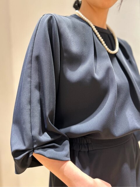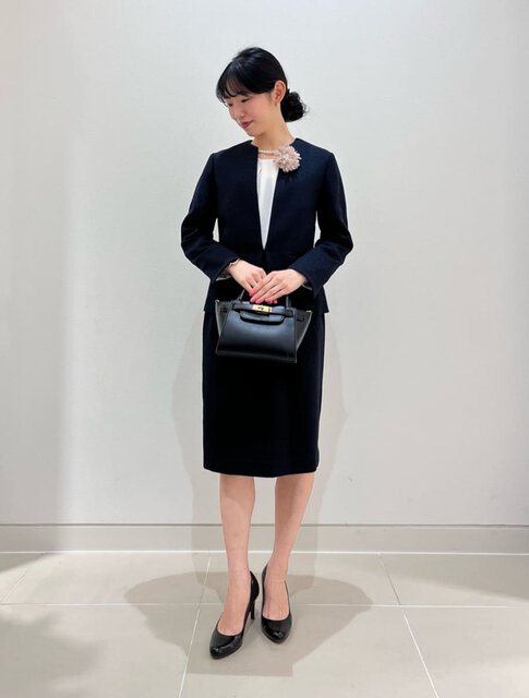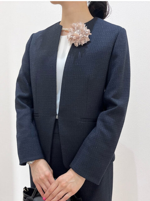 きれいな落ち感とほどよい光沢感が上品な印象。セレモニーから ビジネスシーンまで幅広く活躍するベーシックなセットアップです。ジャケットの袖口には切り込みが入っているので、折ってブラウスの柄を見せても◎。