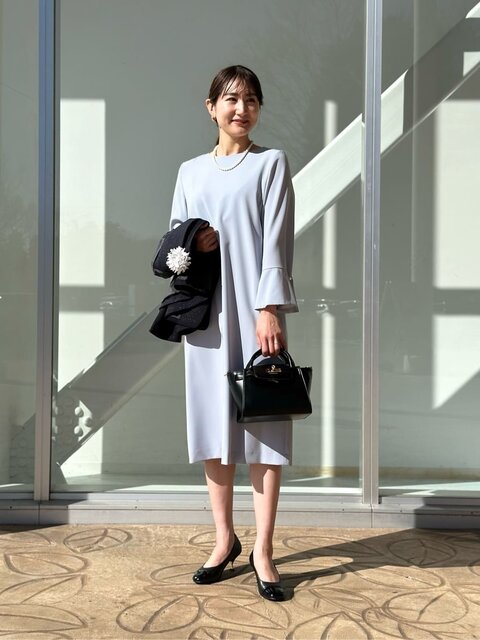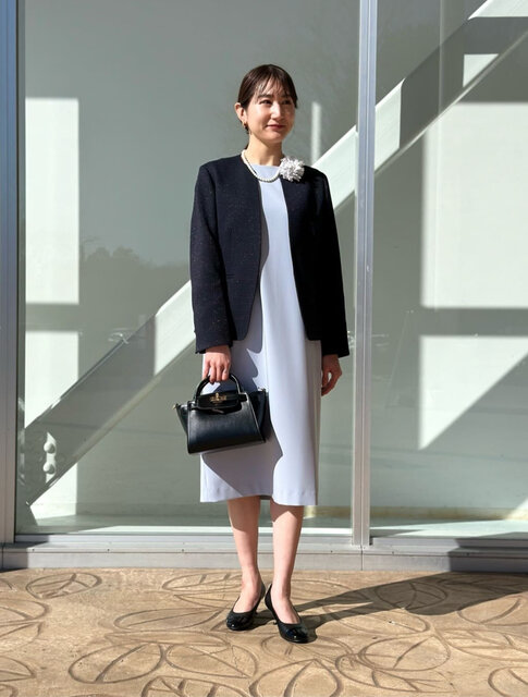 枚でもデザインが可愛いワンピースはライトブルーを選び、ネイビーのジャケットと合わせても重たくなりすぎないようにしました。ジャケットはラメが入っていて綺麗です。コサージュやパールのネックレスを合わせ華やかなセレモニースタイルにしました。