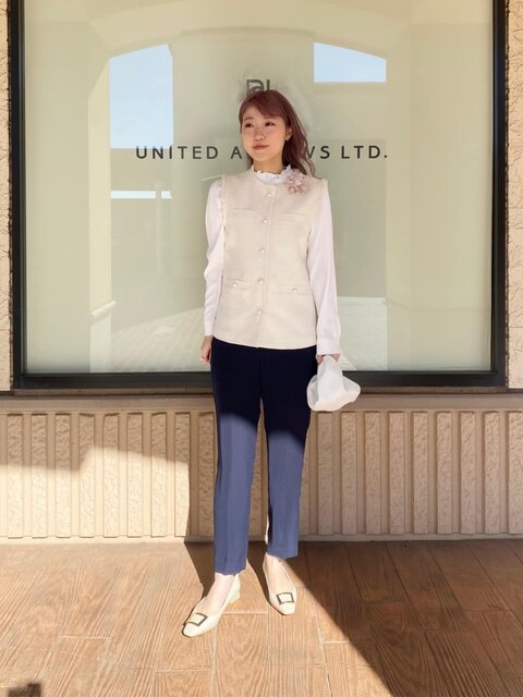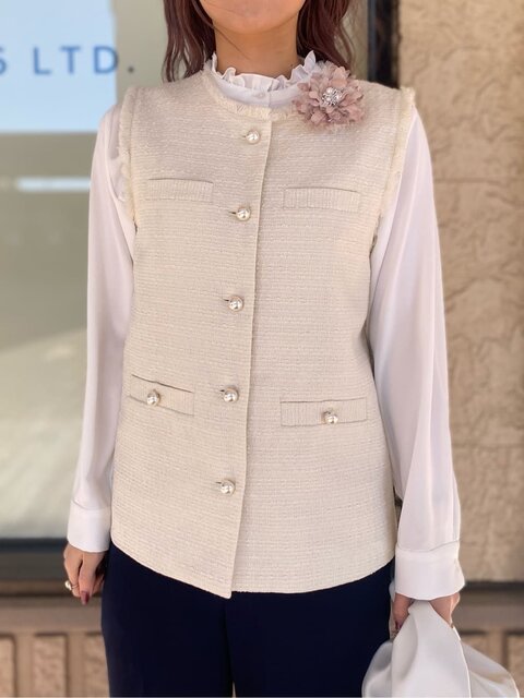 ツイードベストを使用したかっちり過ぎないセレモニースタイルです。 ベストはパールのボタンが華やかな印象でセレモニーシーンにおすすめ。