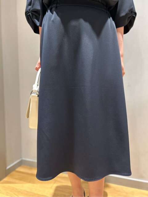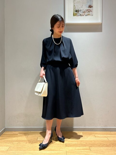 ジャケットは、キーネックで顔回りがすっきりと見えるのも特徴です。丈感は少し短めに仕上がり、スカートやワンピースともバランス良くまとめられます。スカートは膝丈のデザインで幅広いシーンで重宝します。