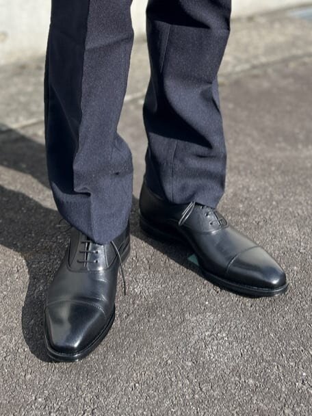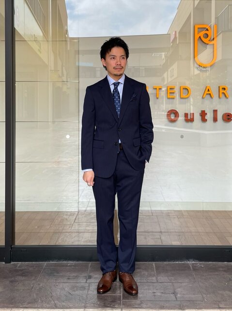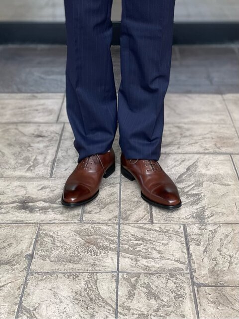 ネイビーのピンストライプにブラウンの革靴を合わせたコーディネートです。 シャツやネクタイはブルーで合わせ革小物はブラウンで統一感を出しています。 ピンストライプのスーツですので、春の買い替えやフレッシャーズとしてもお使い頂けます。