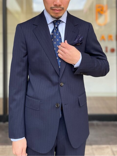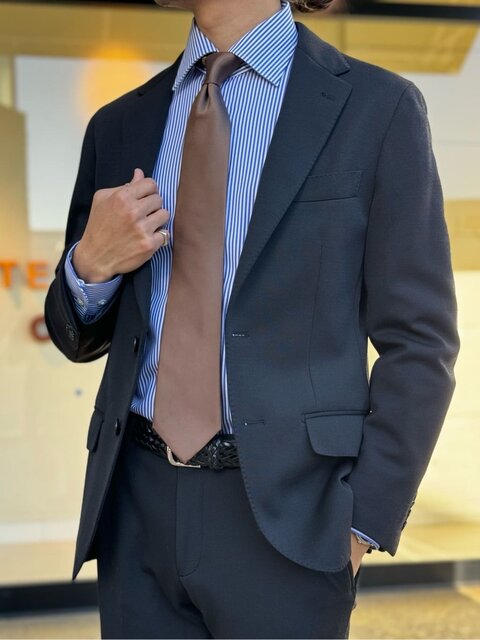 程よいアクセントになるストライプ柄のスーツに合わせて品のあるドビー柄のネクタイを使用し、立体感のあるコーディネートに。 ビジネスシーンでも活躍し、背抜き使用のため通年着用頂ける点もおすすめです。