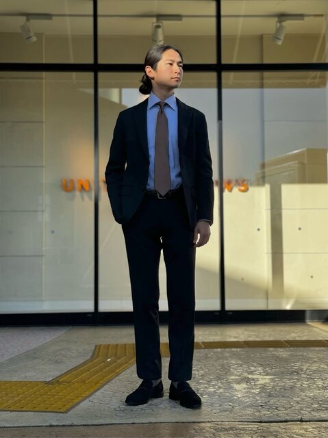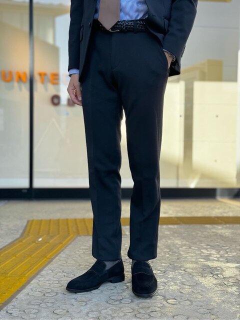 伸縮性に優れた動きの取りやすいセットアップを着用したセミフォーマルスタイル。ジャケットのインナーにカットソーやニットなどを合わせて、カジュアルダウンさせてもスタイリッシュにまとまります。