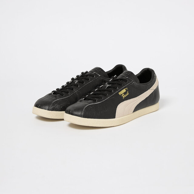 1970年代活躍したブラジルで最も偉大なサッカー選手のために作られたという「プーマ ブラジル」を、経年変化が楽しめるクラックレザーで素材別注。履き続ける度に愛着が増す一足に仕上げました。徐々にひび割れする型押しのロゴも、ヴィンテージライクなムードを後押しするこだわりのディテールです。