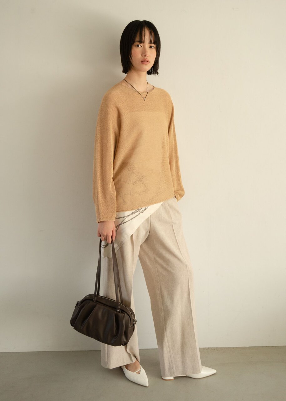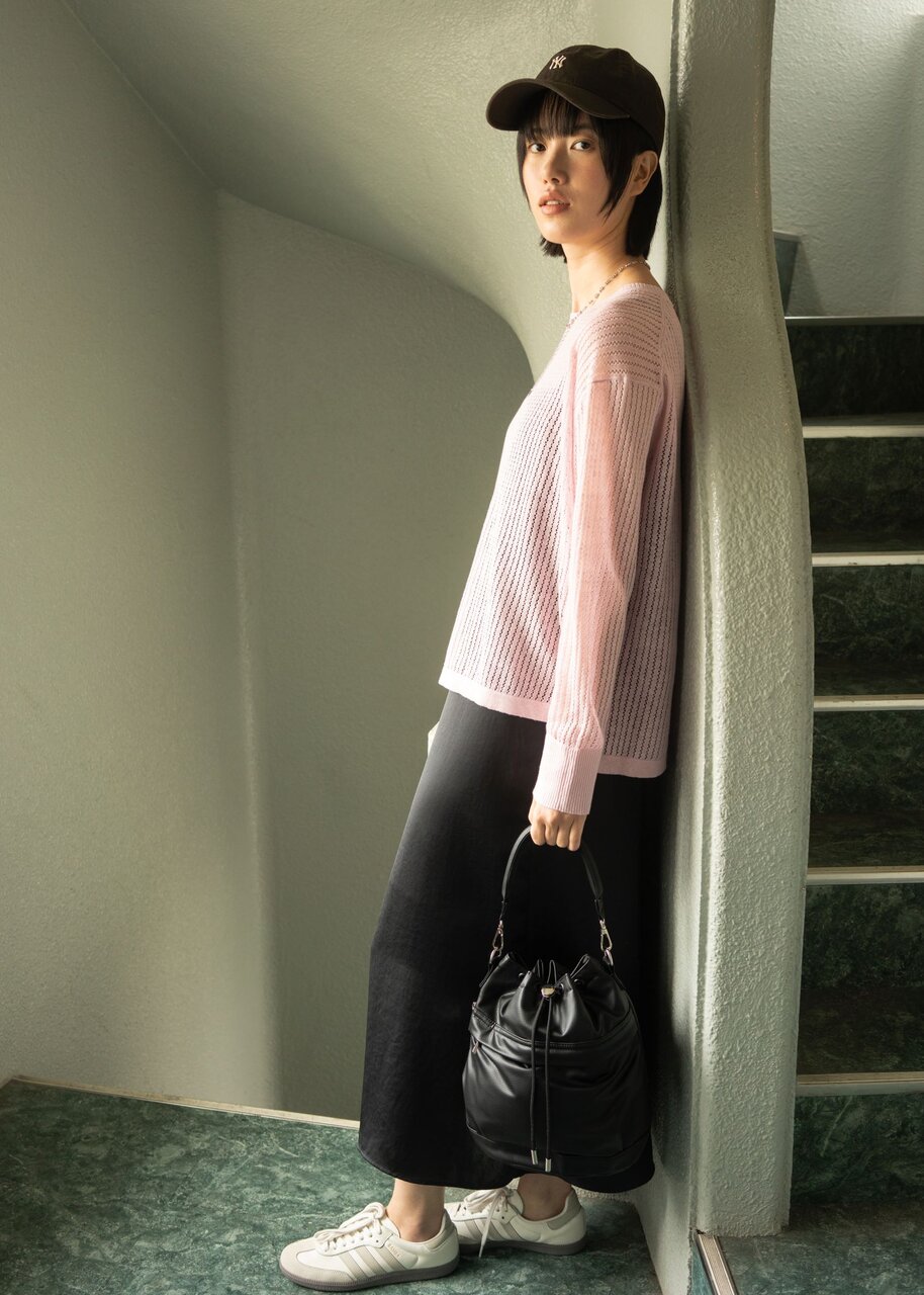 柔らかなカラーでまとめた、リラクシーなこなれスタイル。