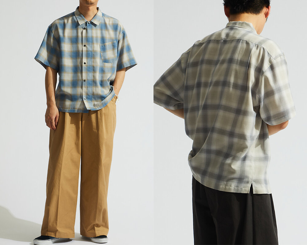 ニュアンスのあるオンブレチェック柄にドライタッチな着心地、アクセントとしてメタリックカラーのボタンを配した、夏らしい1着です。