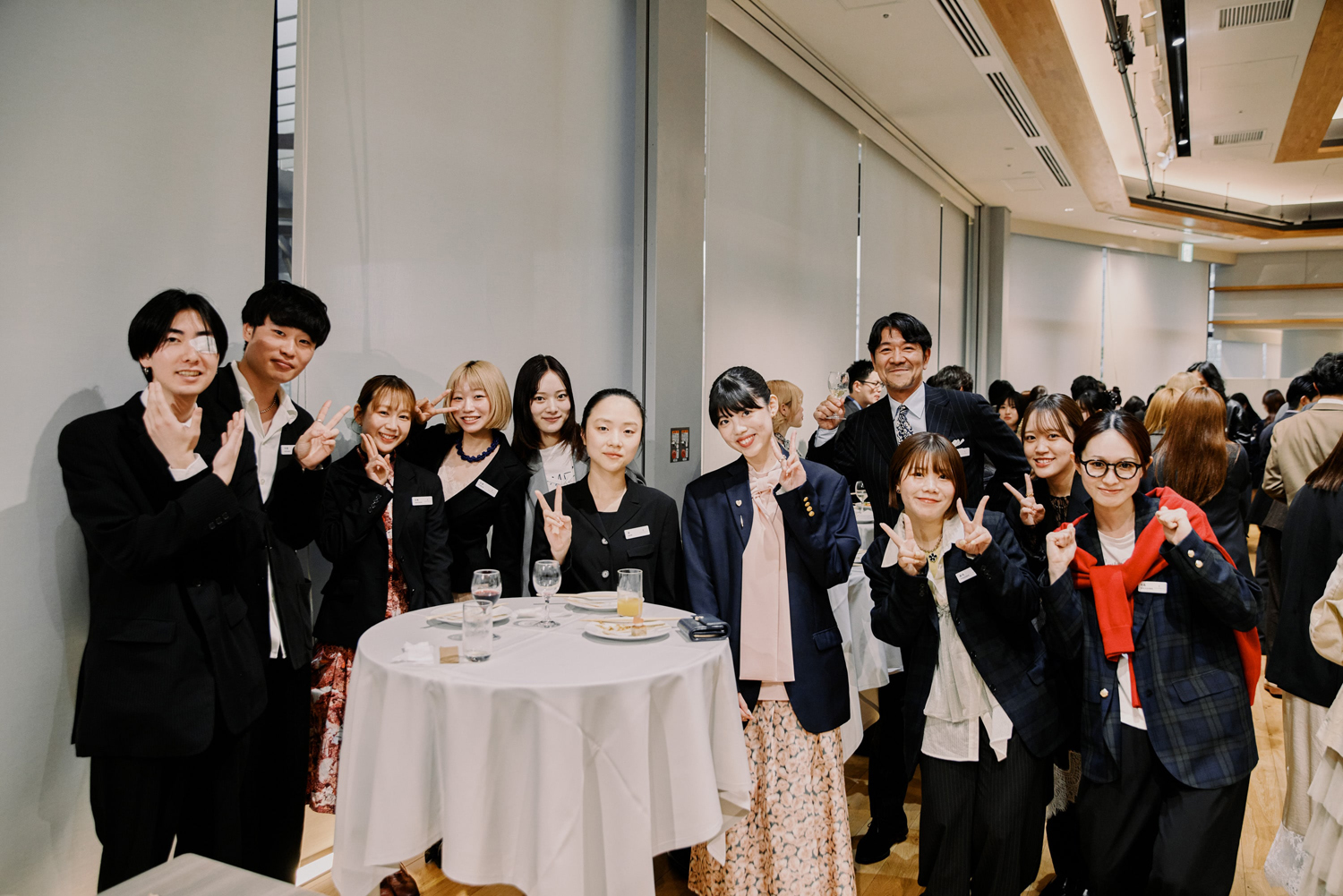 自己紹介をきっかけに、互いのファッションを褒め合ったり、写真撮影を楽しんだりと、自然と会話が広がり、同期との距離も少しずつ縮まっていきます。CEO松崎さんをはじめ、役員や事業本部長、人事部 採用担当の先輩たちも各テーブルを回り、会場は終始なごやかな雰囲気に包まれていました。