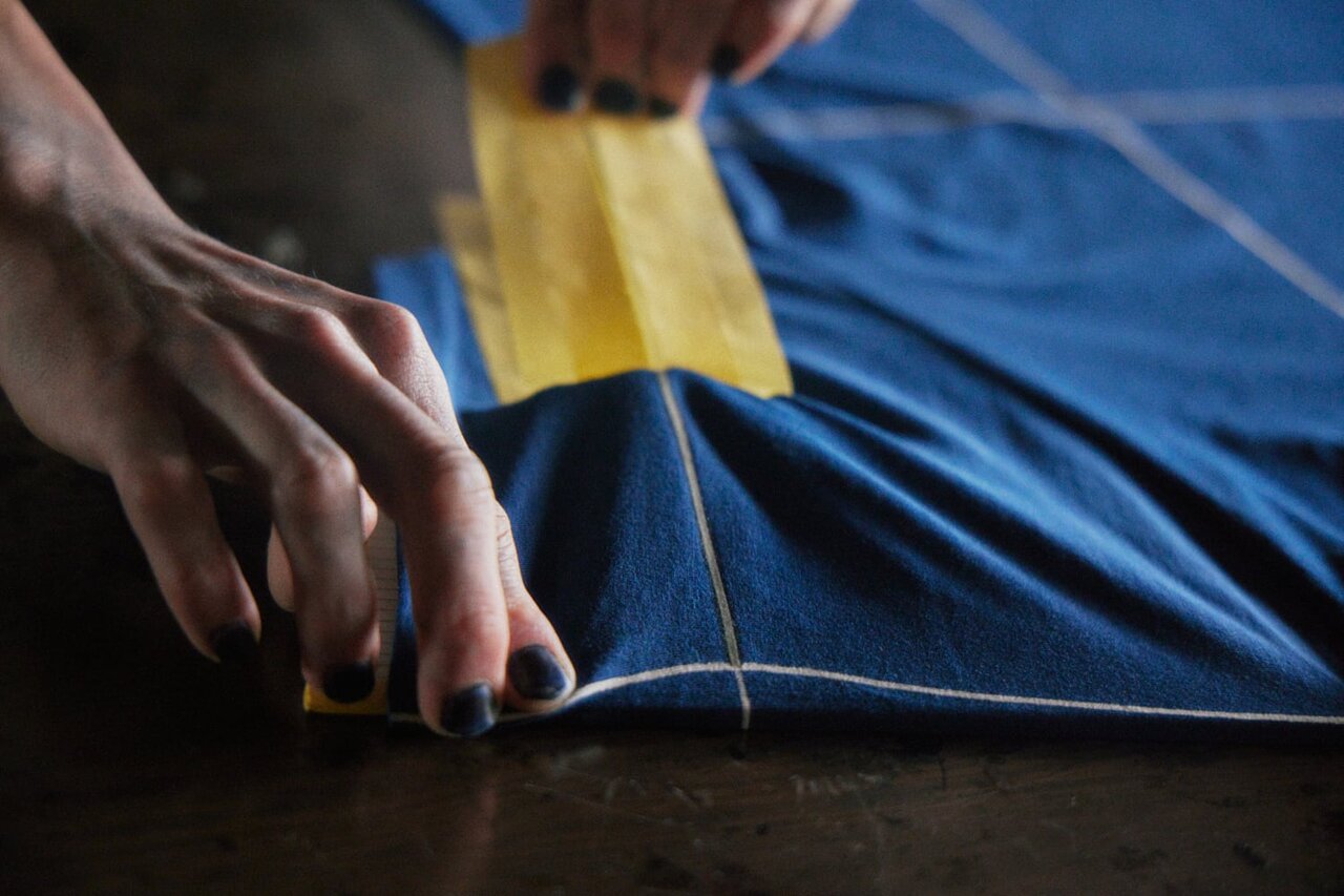 フリーハンドで抜染のための繊細な目安をマスキングテープで施す。その上から抜染のりを載せ、余剰分を取り除いたら、ゆっくりとテープを剝がす。洗いをかけると、線として活かされた折り目ができる。これを、前身頃縦2本、後ろ身頃縦2本、前身頃横1本、肩線、後ろ身頃横1本袖2本と、抜染だけでも5日間かけておこなう。