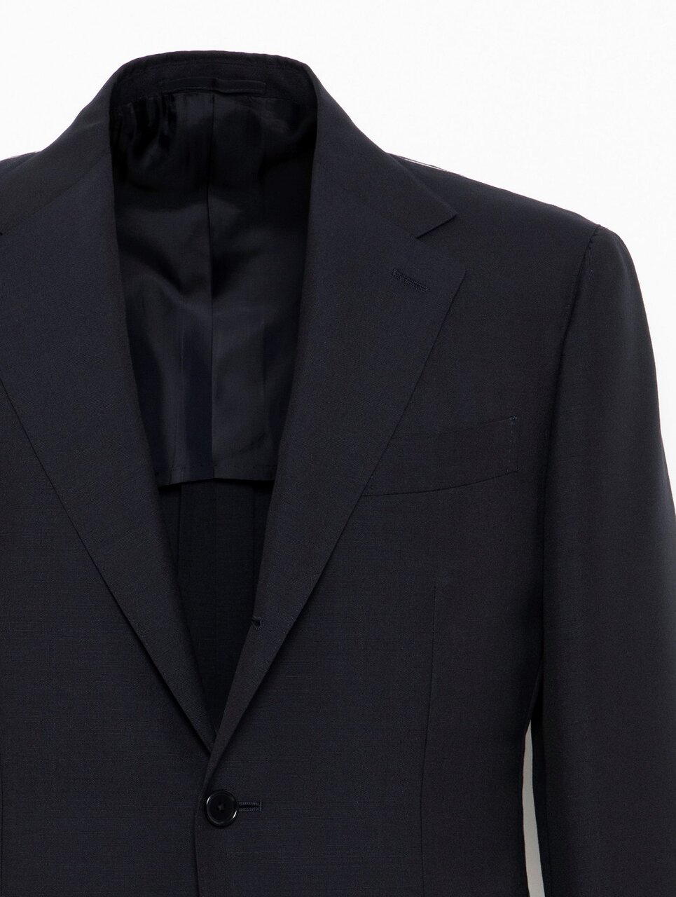 2024年秋冬より新たにスタートした「モダンクラシック モデル」のスーツです。ジャケットは、広めの肩幅とやや長めの着丈、ウエストにかけてシェイプされた美しいシルエットが特徴。ボトムスは、上着のシルエットに合わせ、やや深めの股上とストレート気味のラインがポイントです。表地には、国内毛織物産地・尾州の〈山栄毛織〉のウールとモヘヤ混紡のトロピカル素材を使用しています。細番手の糸で織った繊細な表情に加え、モヘヤ独特のシャリ感と上品な光沢が特徴。通年着用が可能で、ビジネスからセレモニーシーンまで幅広く活躍する一着です。