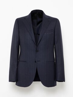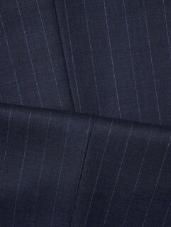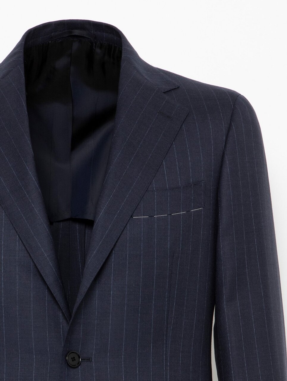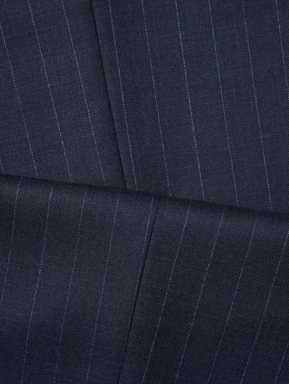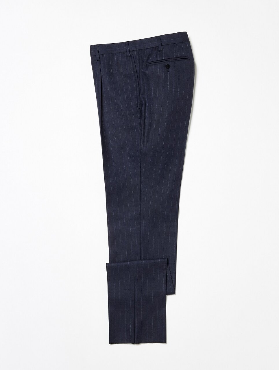 ウール100%を原料にした、なめらかな風合いと上品な光沢感があるブルー系シャークスキンの杢ストライプ素材を使用しています。時代感のあるほどよくゆとりがあるシルエット、シングル段返り3つボタン、ノッチドラペルのスタンダードなデザインかつ洗練された印象の「スマート」モデルを採用。素材特有のナチュラルなストレッチ性に加えて、少しの雨など水滴を弾いてくれる撥水性を備えているのが特徴です。ビジネスシーンから式典まで幅広く活躍する一着です。