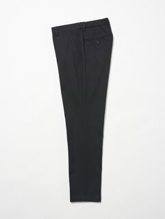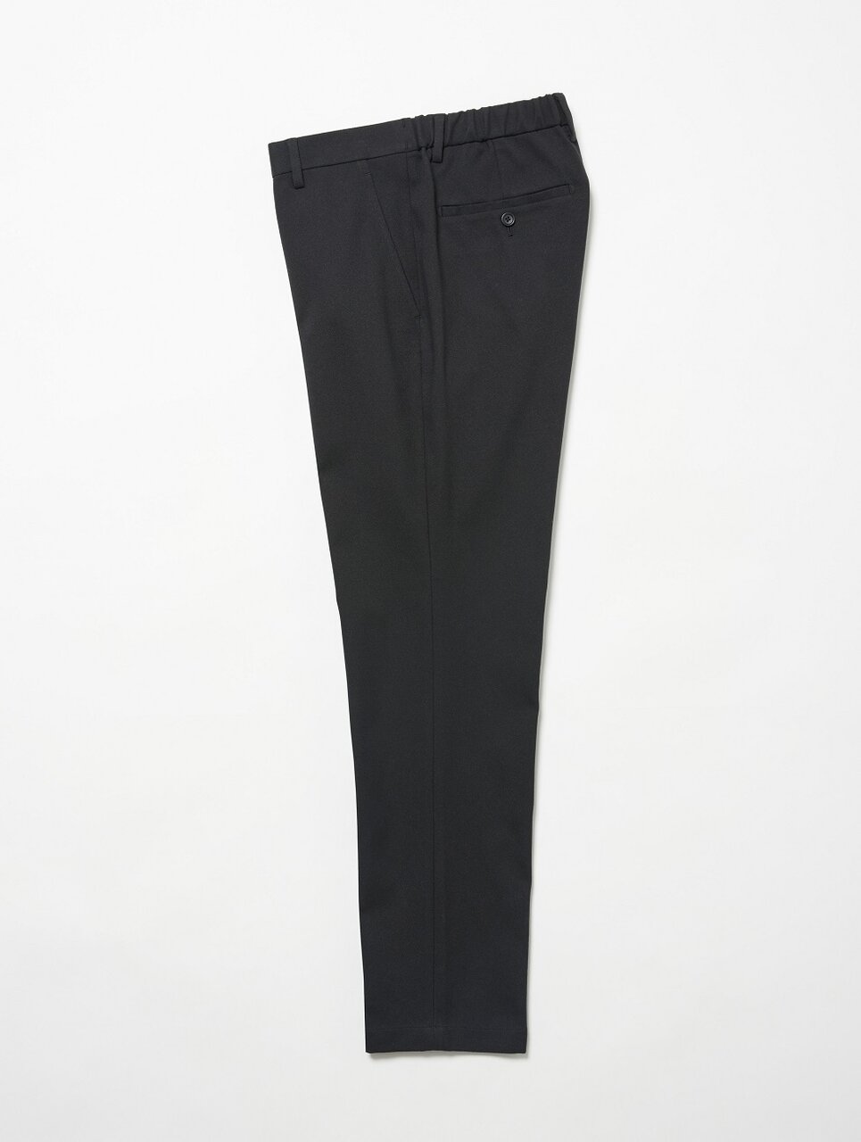 同素材のパンツは、ウエストゴムとドローコードを配したイージー仕様。股上をやや深めに、丈を少し短めに設定し、快適な穿き心地とクリーンな印象を両立。オンオフ問わず着回せる万能な一本。