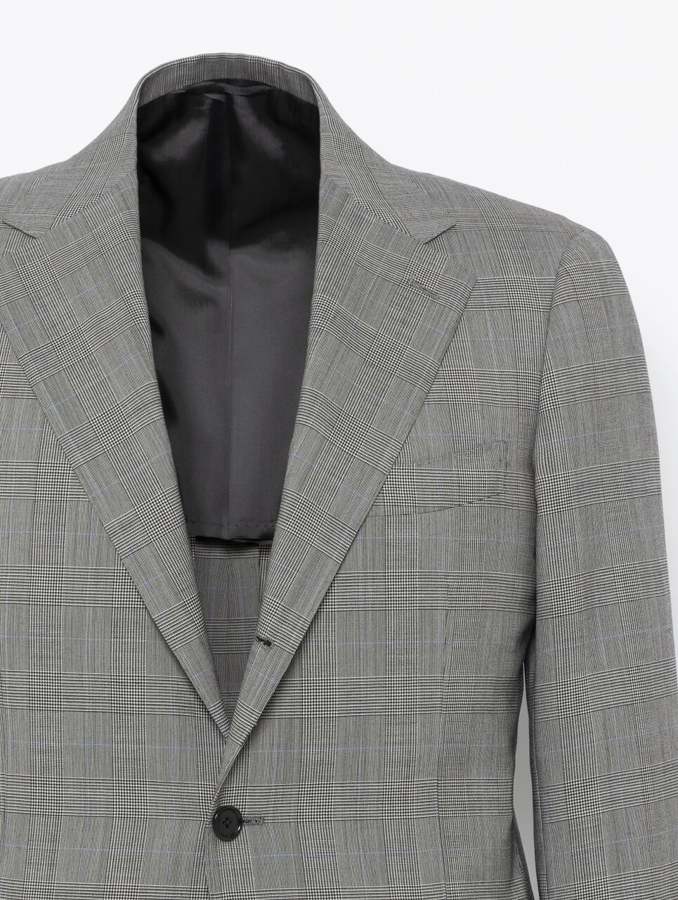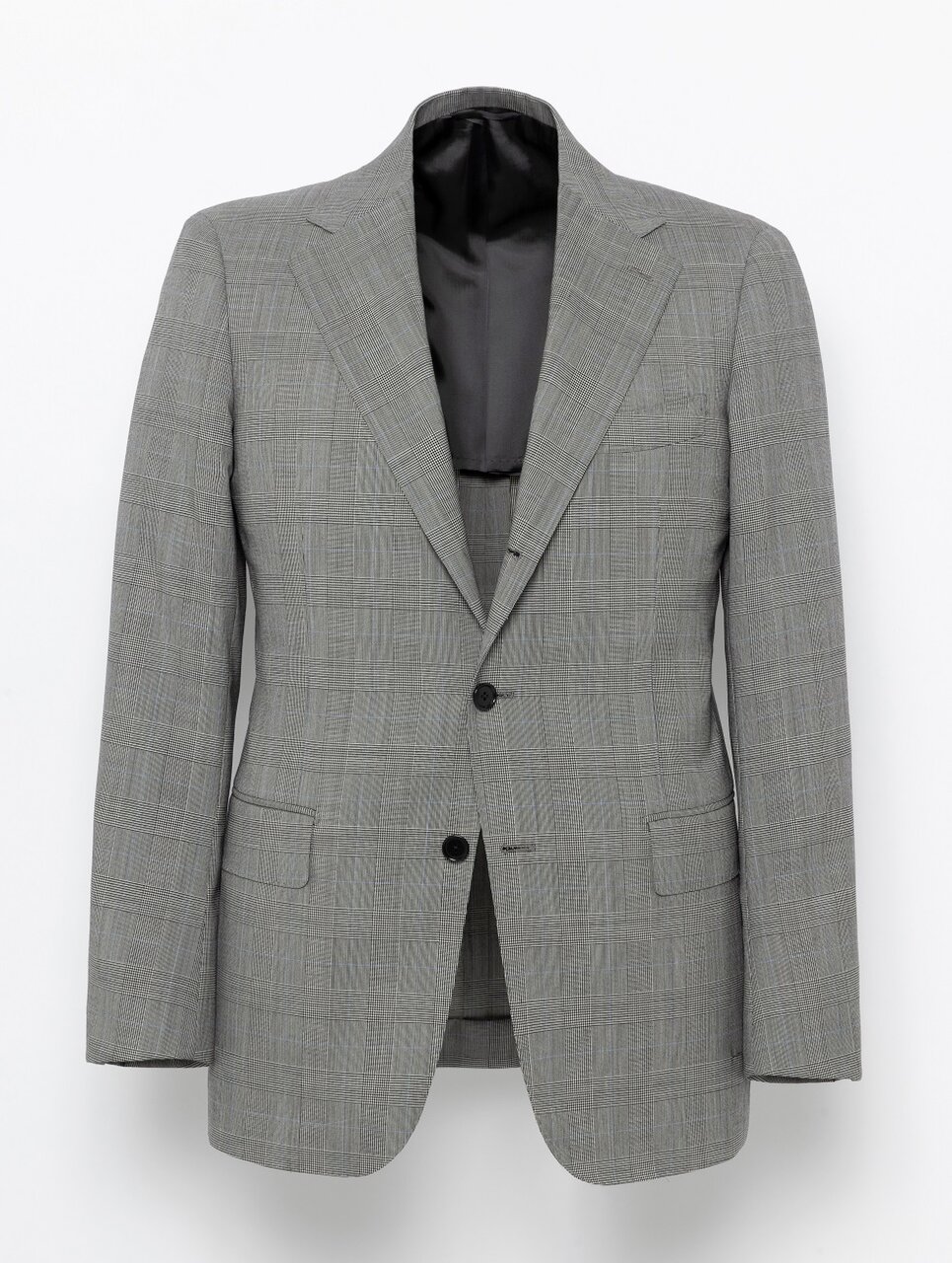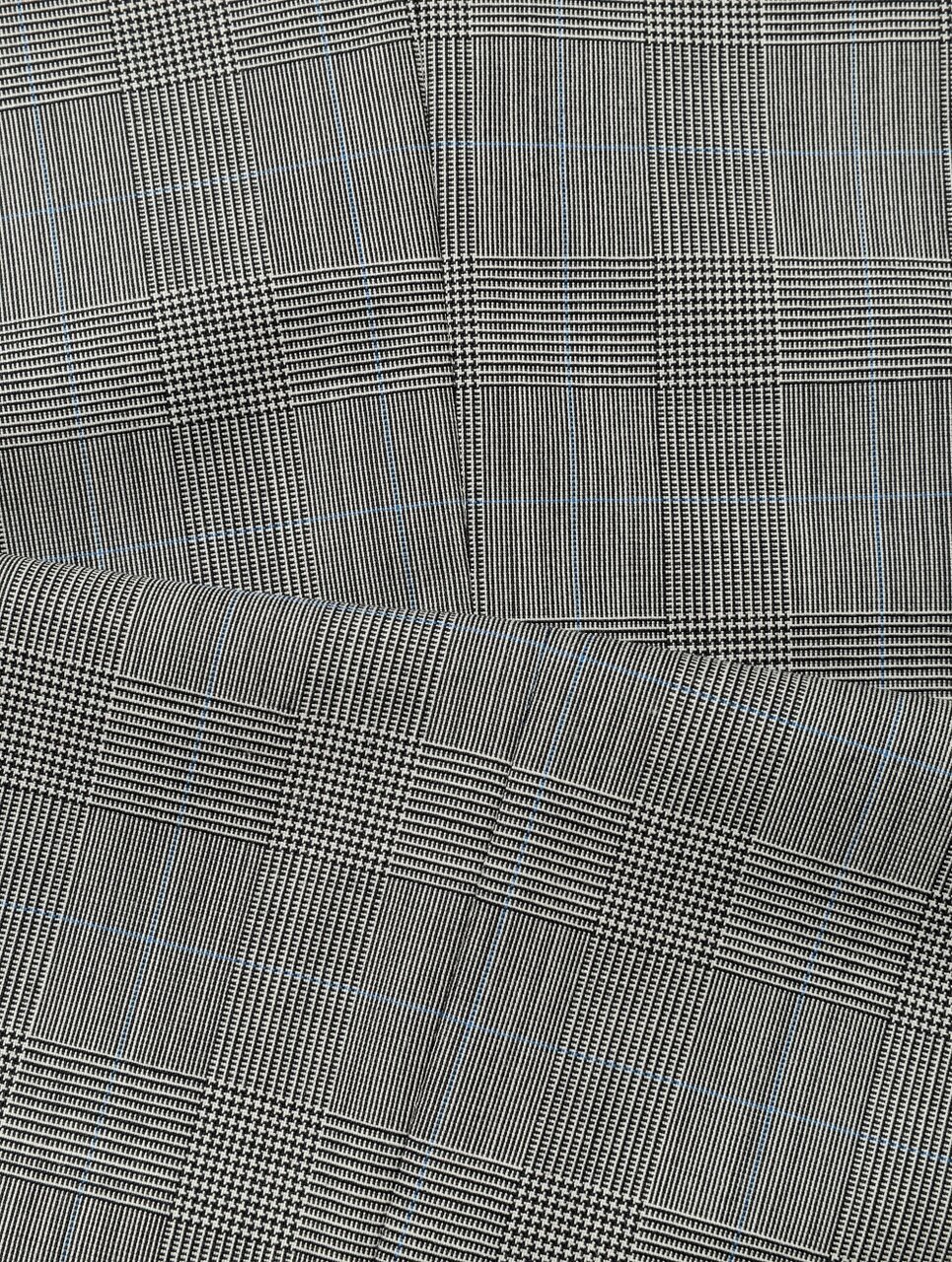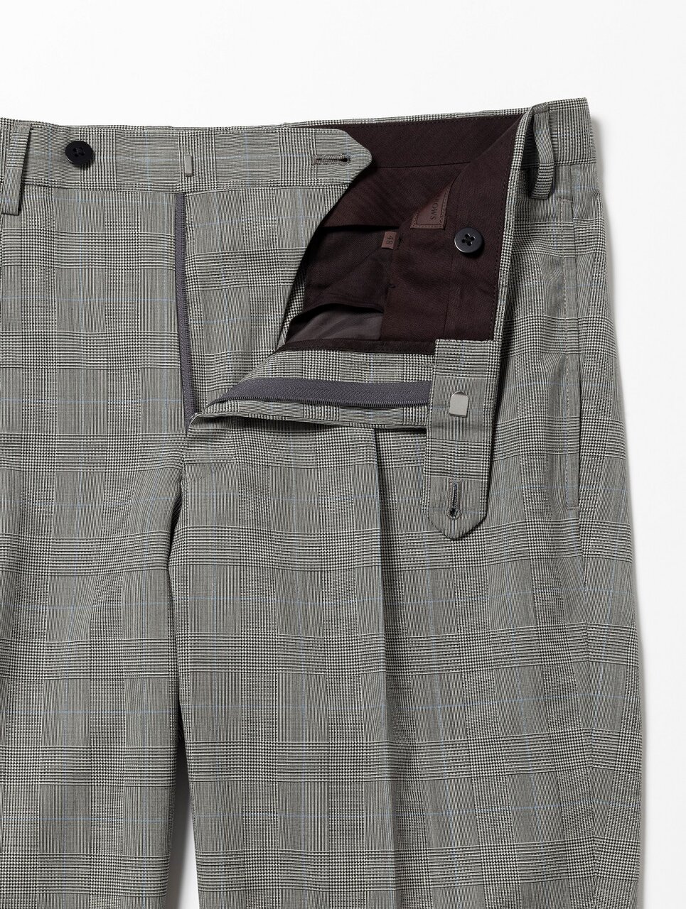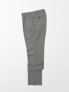 国内の服地メーカー〈御幸毛織〉で作製したプリンスオブウェールズ柄の生地を使用しています。繊維の細い原料を使用して織り上げた生地は、柔らかくしなやかな質感と上品さが特徴です。デザインは、直線的なショルダーラインで端正な雰囲気が特徴の「レギュラー」モデルを採用。弾力感に優れた芯材を使用することで、身体に沿う立体的な美しいフォルムを生み出し、保形性にも優れています。ボトムスは、ワンプリーツの意匠にやや深めの股上と、膝から裾にかけてややゆとりを持たせたストレートに近いパターンを採用しています。
