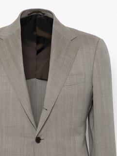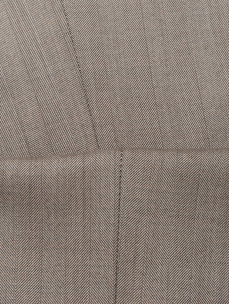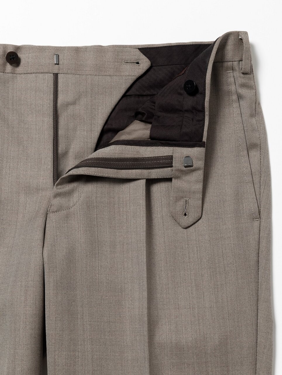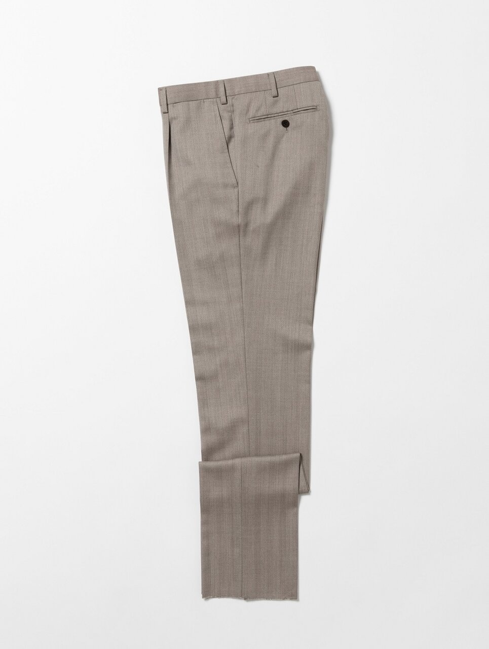 イタリアのファブリックメーカー〈VITALE BARBERIS CANONICO〉のヘリンボーン素材を使用しています。艶やかで柔らかな風合いに加え、明るいベージュのカラーがトレンド感と上品さを演出します。また、生地には撥水加工を施しており、少しの雨にも対応できるのがうれしいポイントです。デザインは「モダン クラシック」モデルを採用。ジャケットは広めの肩幅とやや長めの着丈、ウエストにかけてシェイプされた美しいシルエット。ボトムスは上着に合わせ、やや深めの股上と、膝から裾にかけてややゆとりを持たせたストレートに近いシルエットに仕上げています。