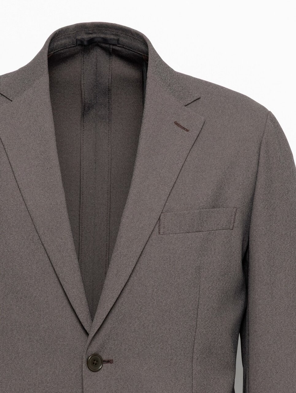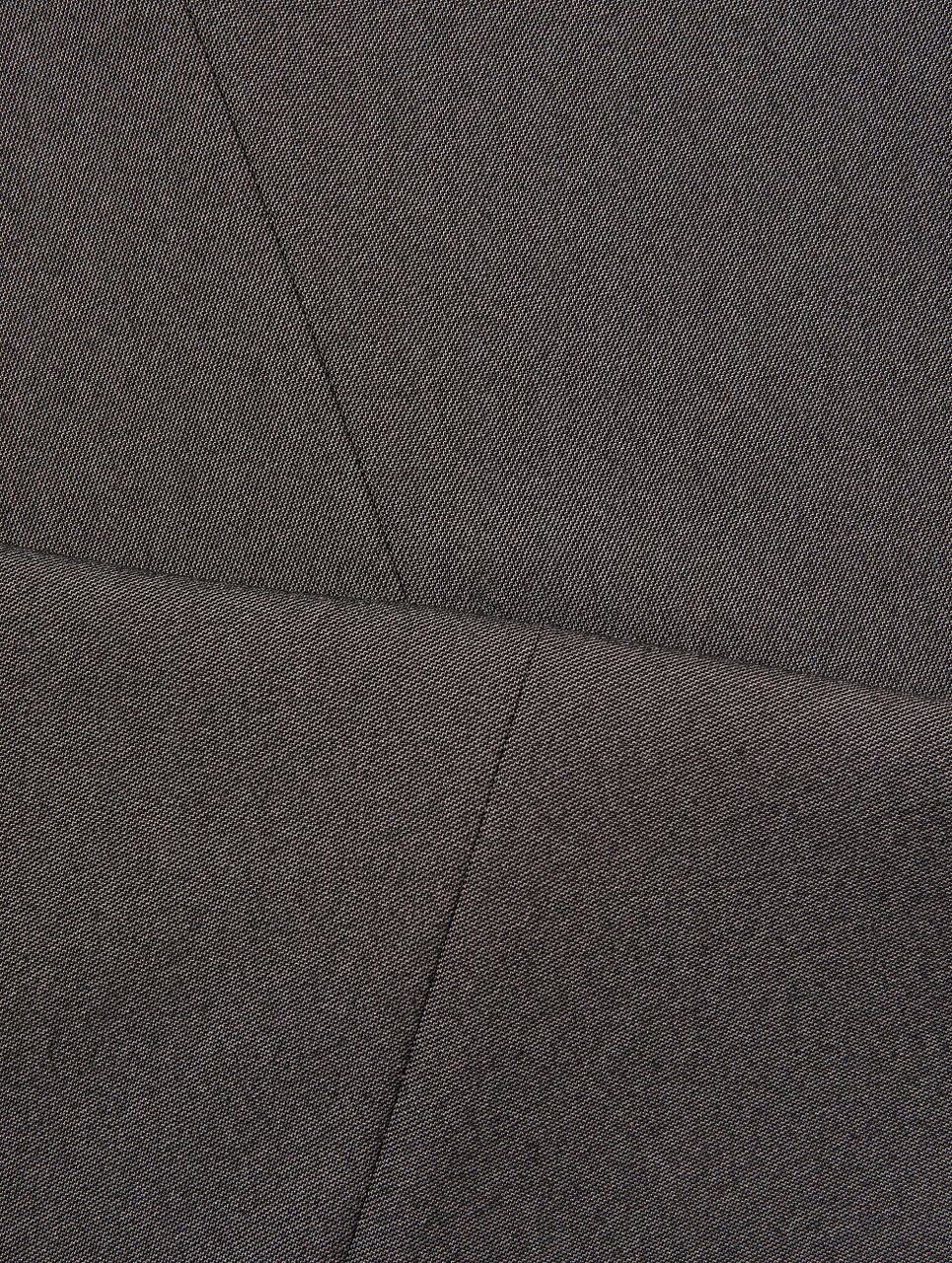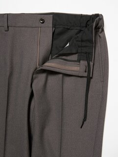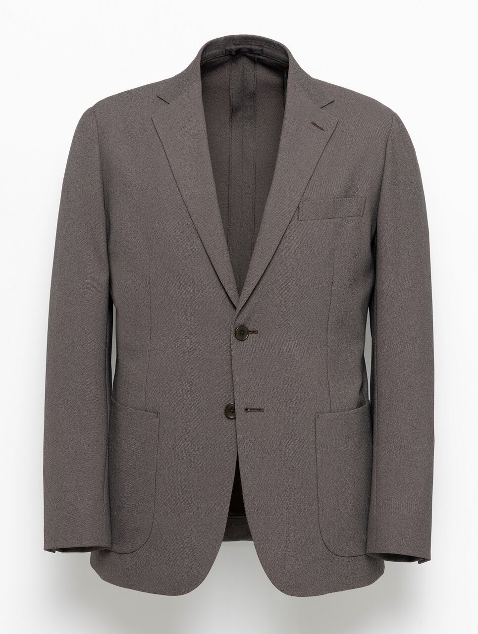 ウールのような上品な表情が魅力の、ポリエステル製シャークスキン素材を使用したセットアップ。