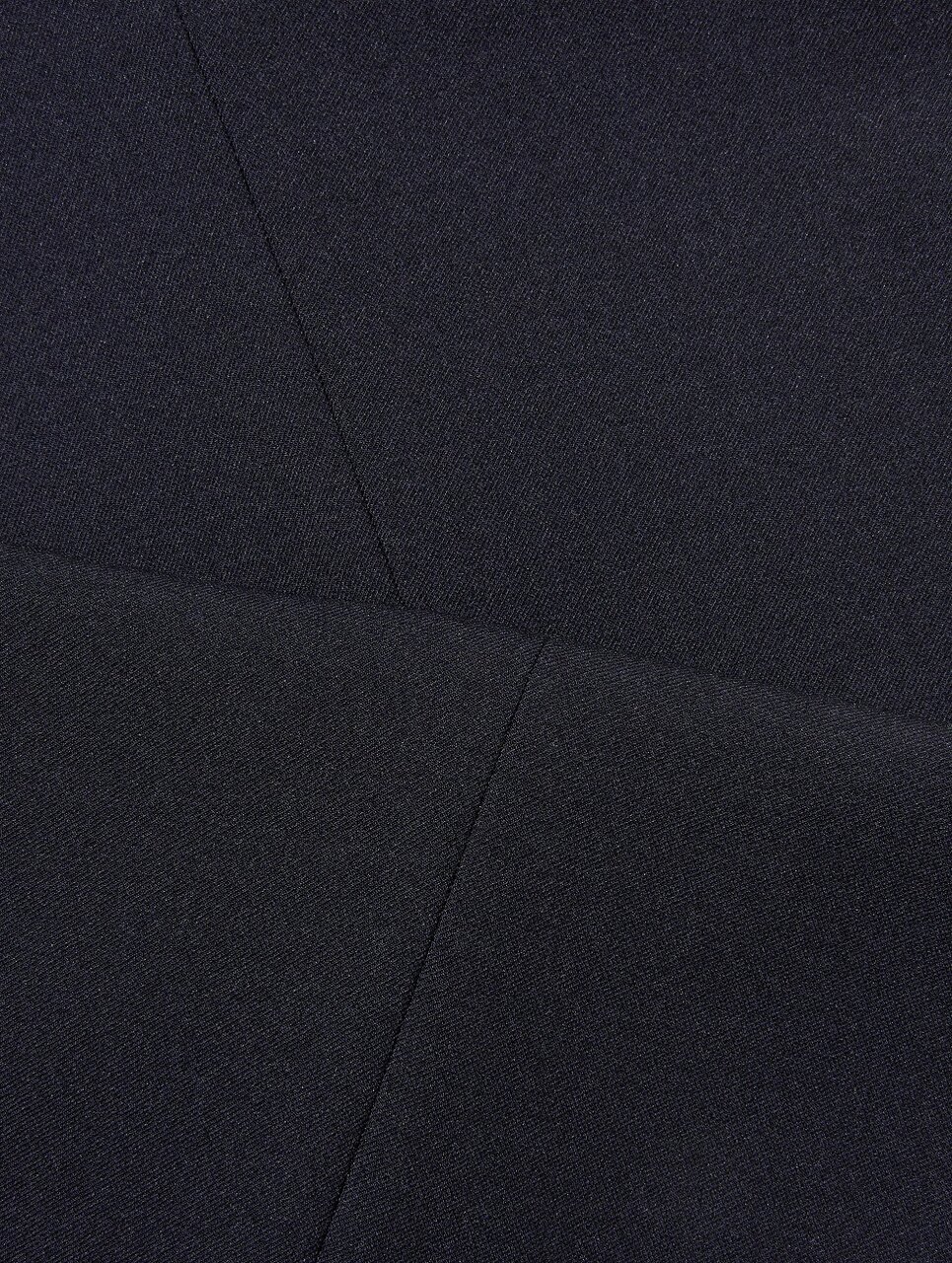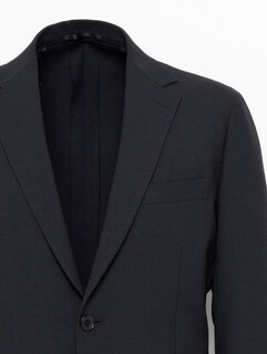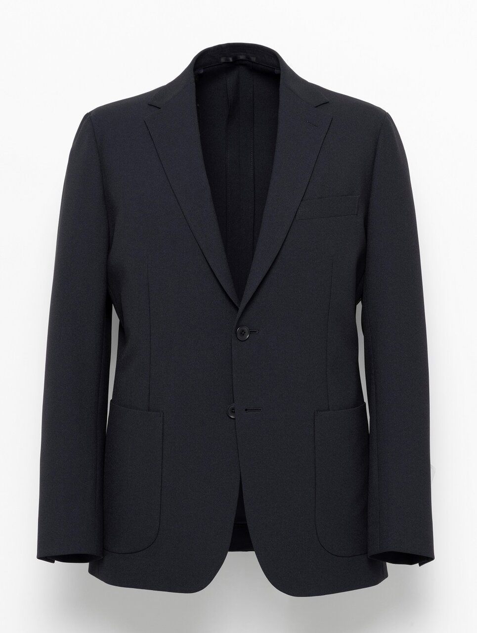 ウールのような上品な表情が魅力の、ポリエステル製シャークスキン素材を使用したセットアップ。
