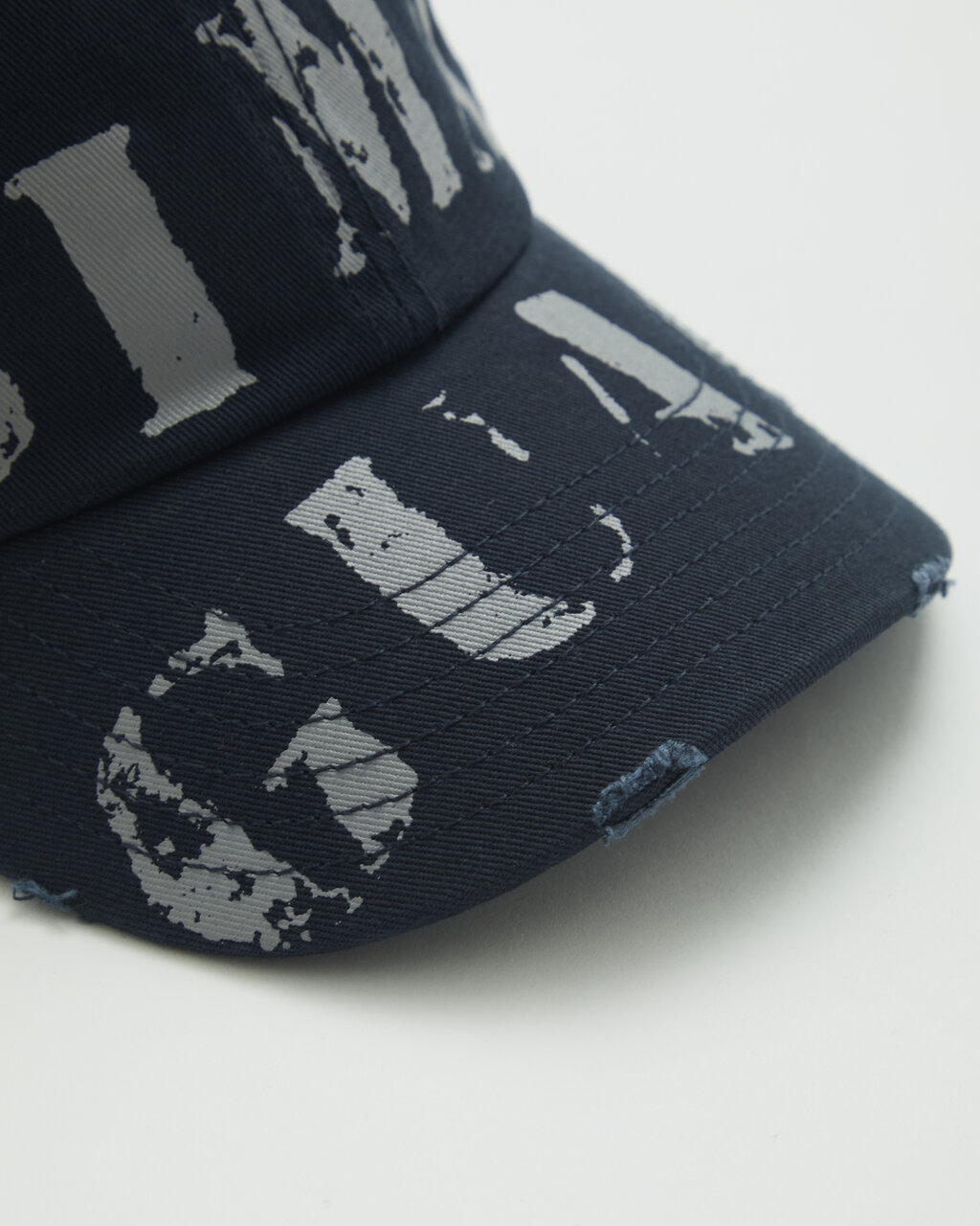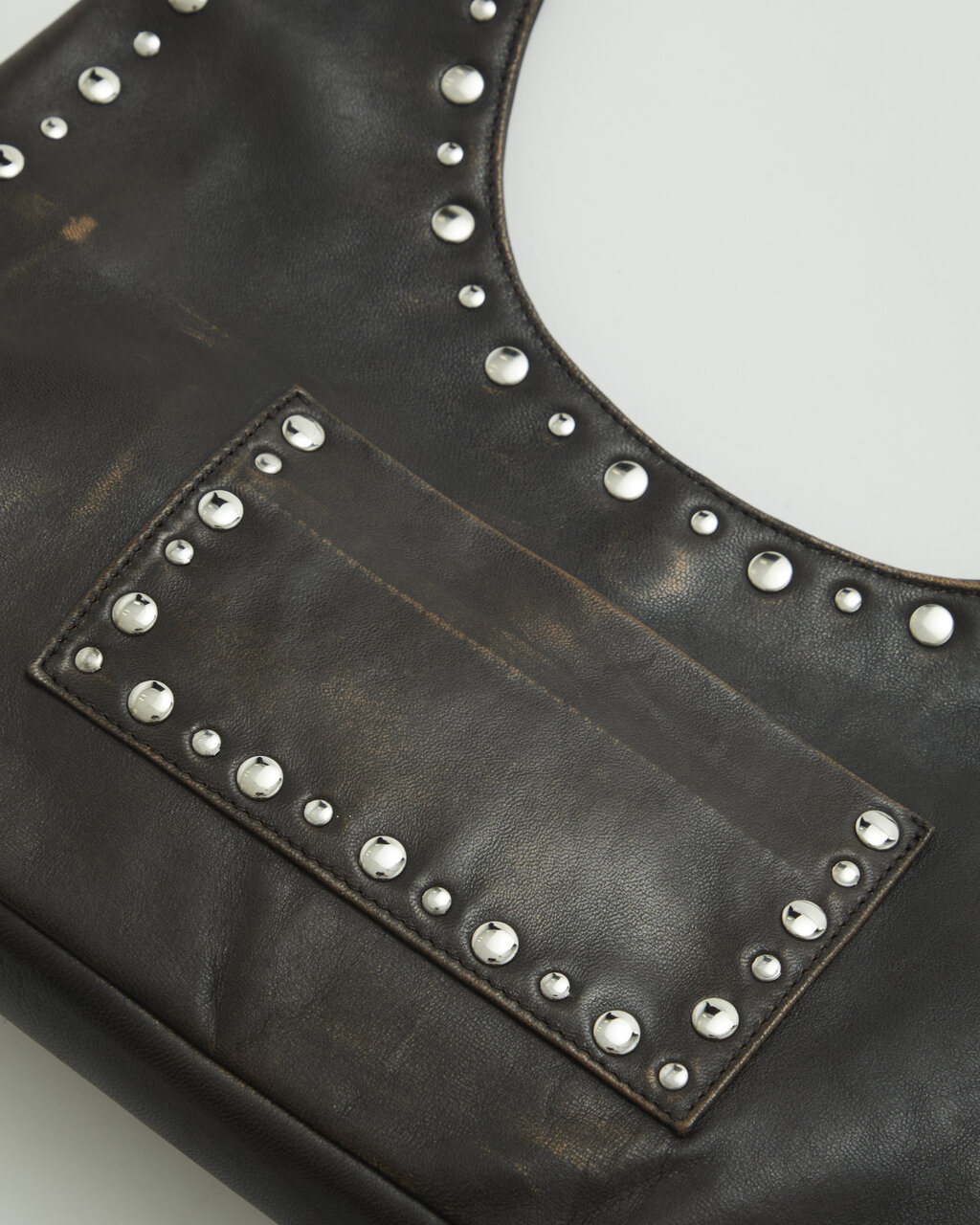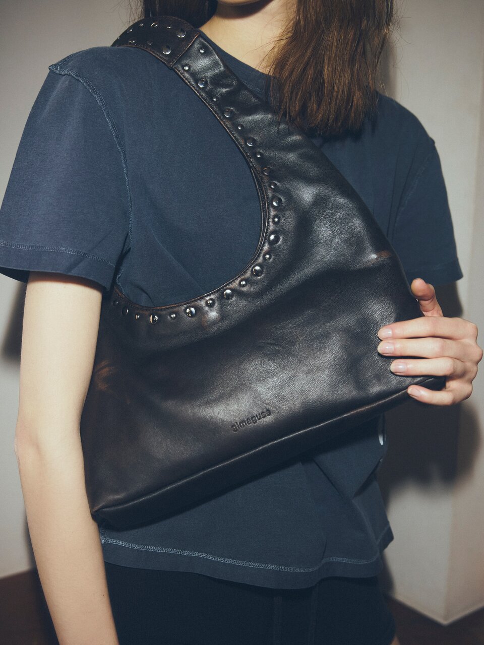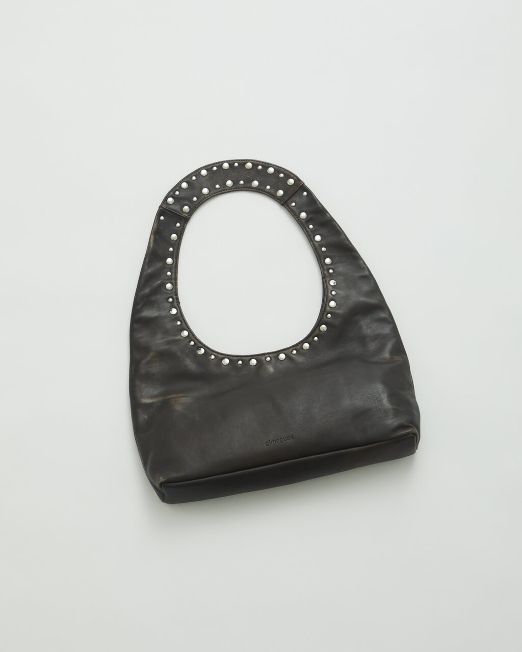 ミリタリーライクなステンシルスタンプでブランドネームが施されたTシャツとキャップは、<アティセッション>限定のネイビーカラーでお作りしました。シルバースタッズがアクセントになった定番の「フランカバッグ」には、ヴィンテージ加工を施したブラウンレザーを落とし込みました。